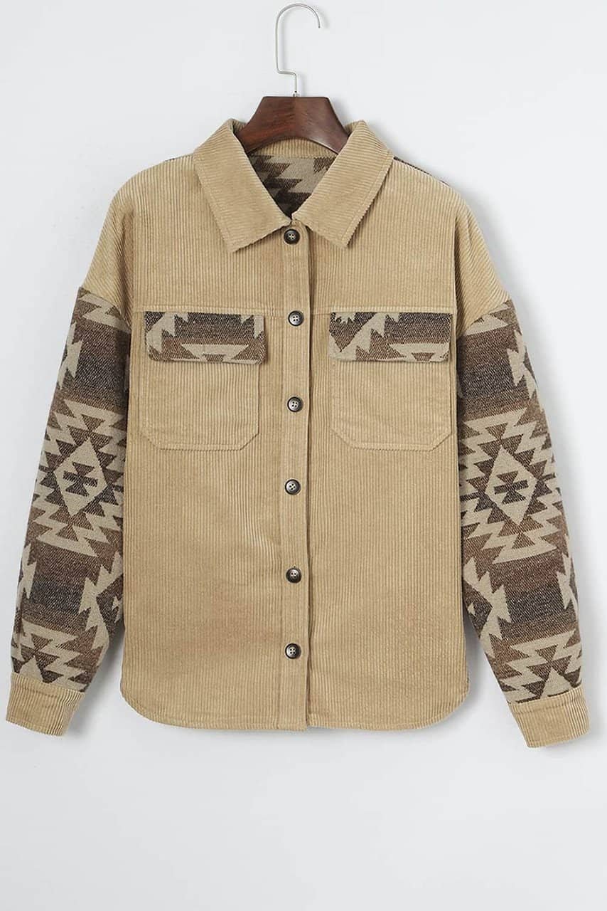 Khaki Aztec Print Patchwork Frayed Edge Corduroy Jacket