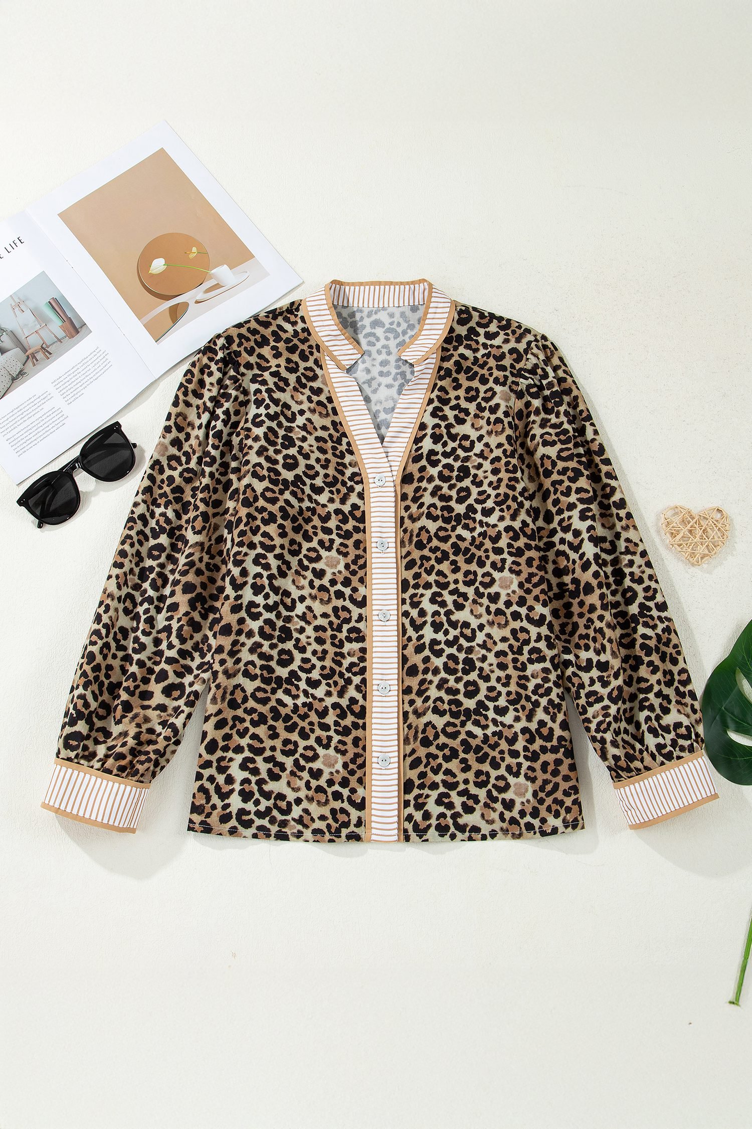 Be the first to review “Khaki Contrast Striped Trim V Neck Leopard Shirt”