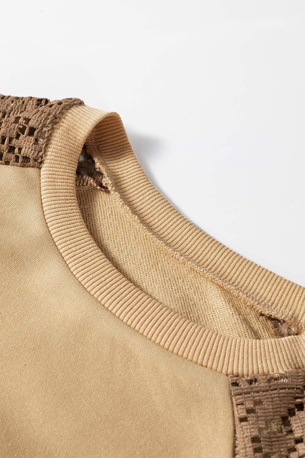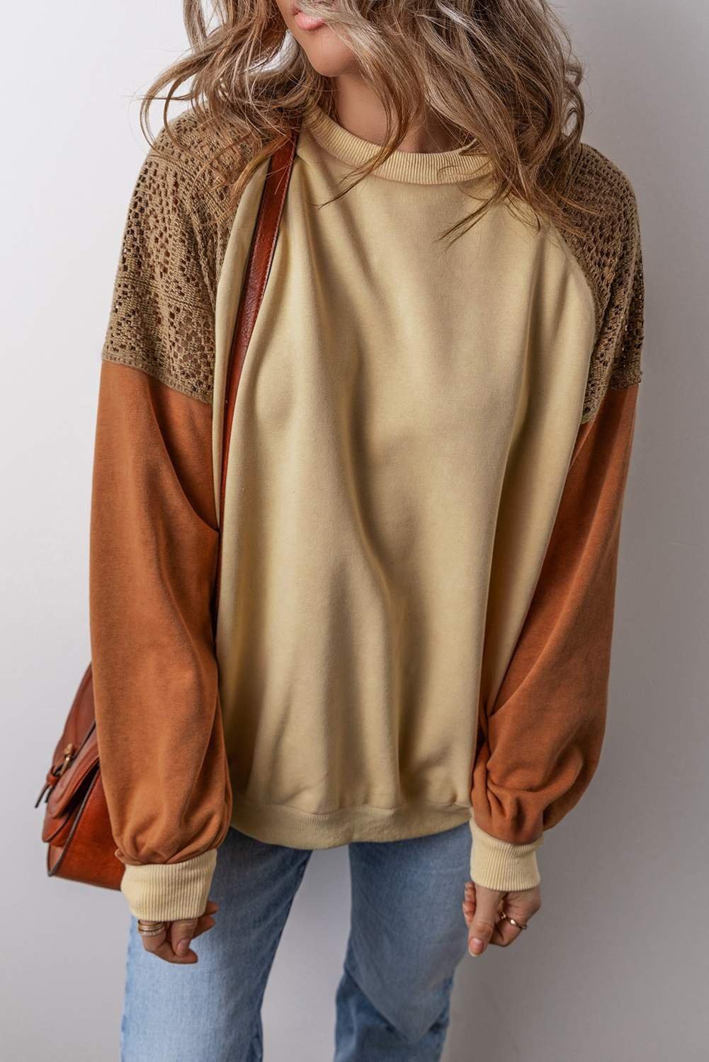 Khaki Lace Patchwork Colorblock Drop Shoulder Sweatshirt