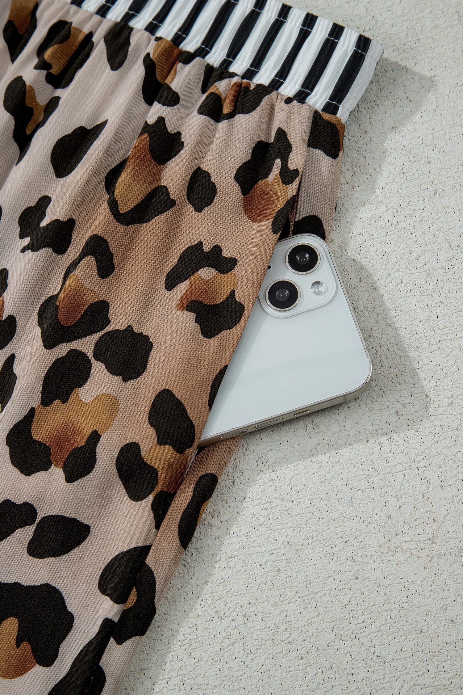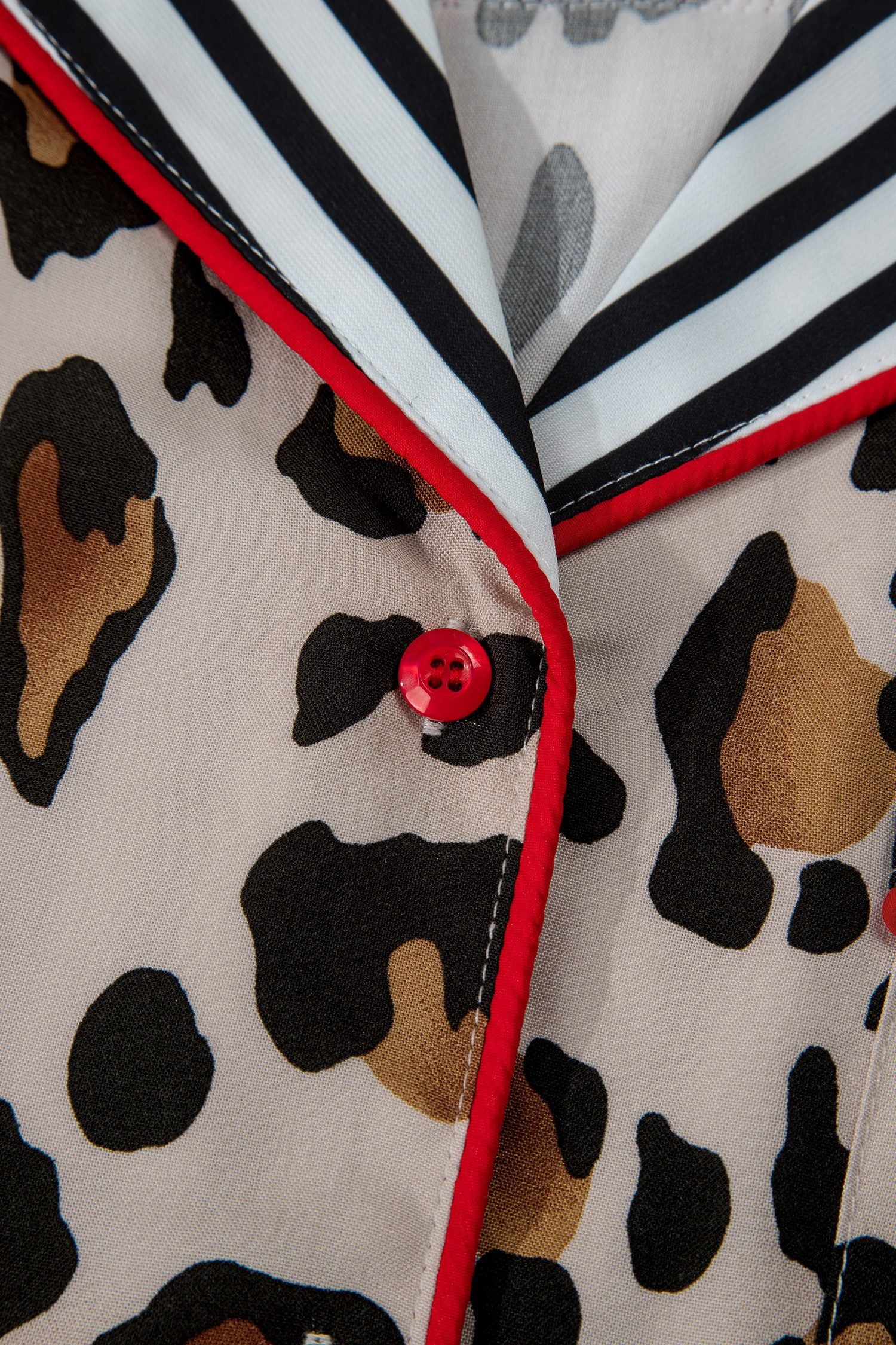 • Stylish leopard print pajamas with striped patchwork for a bold, chic look.