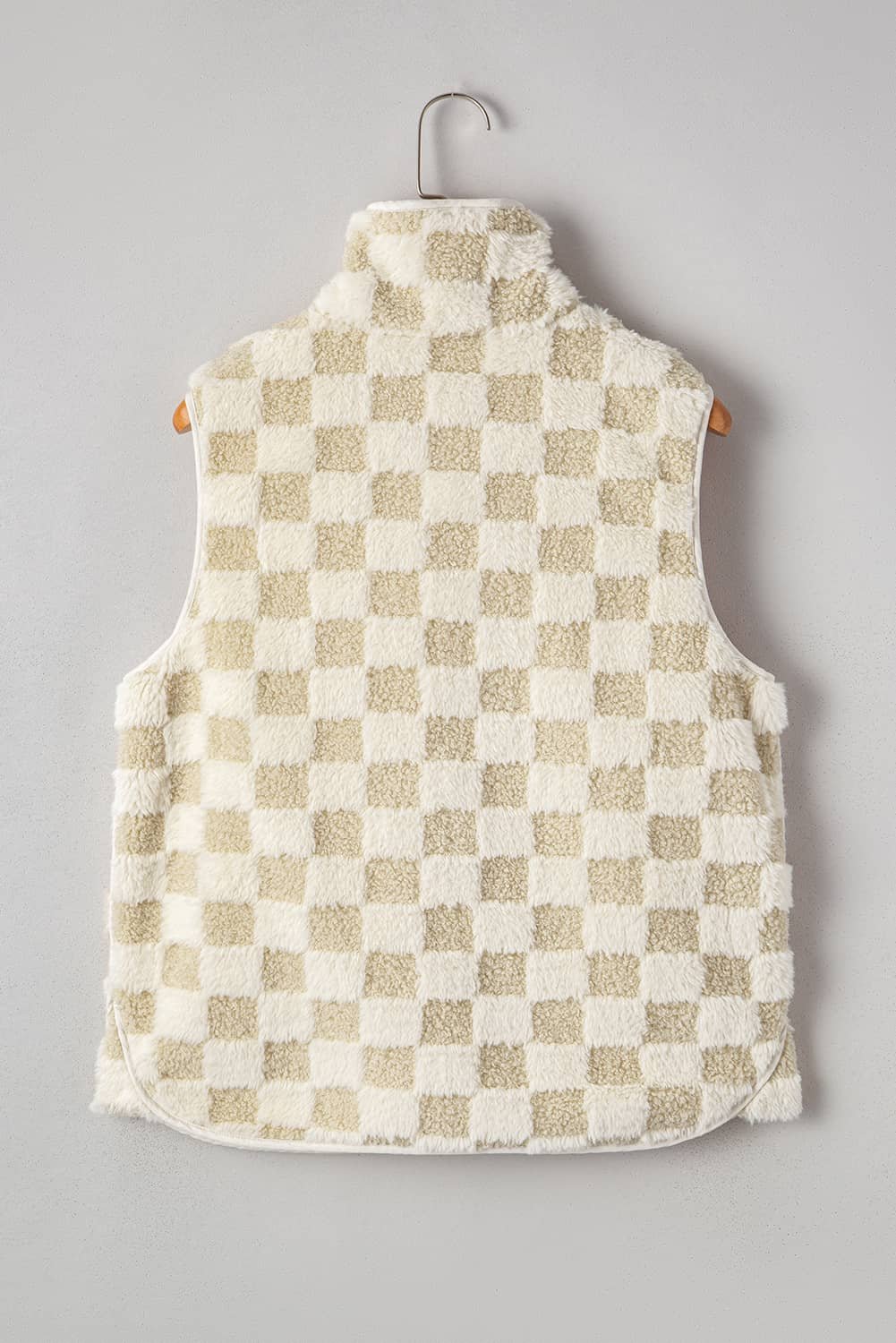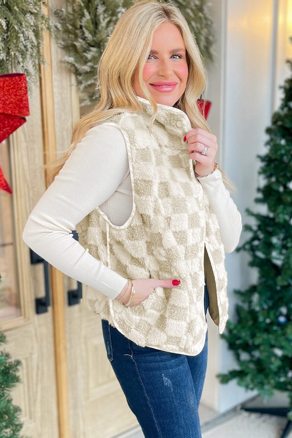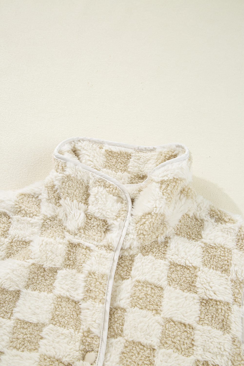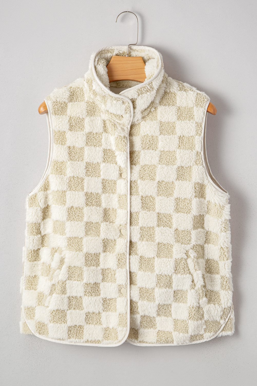 Khaki Sherpa Checkerboard Snap Button Vest Jacket With Pocket