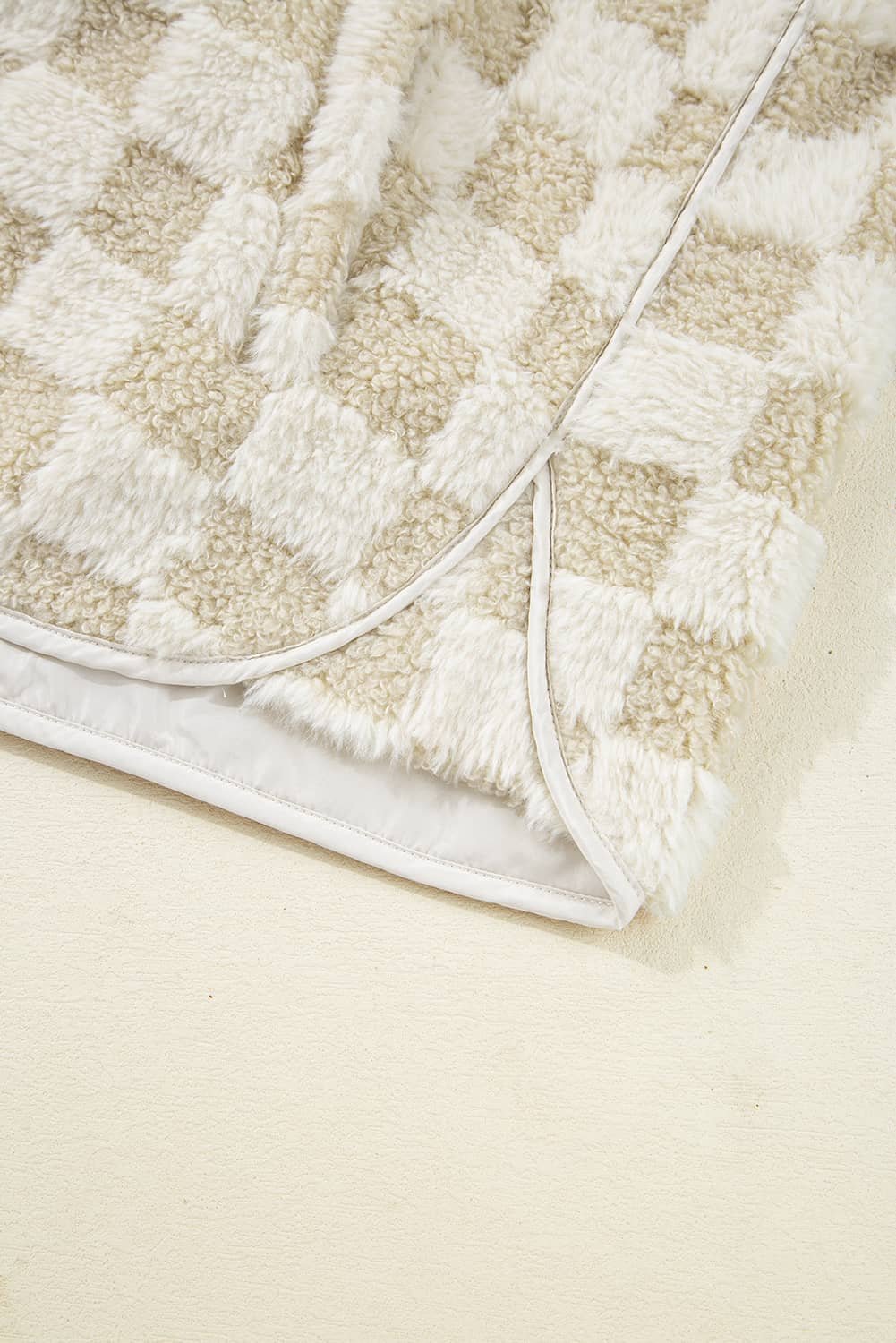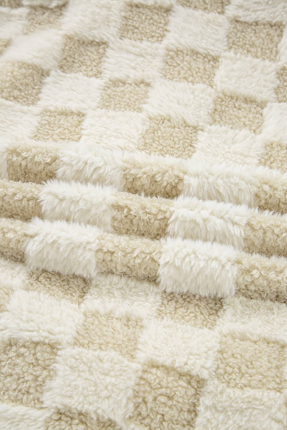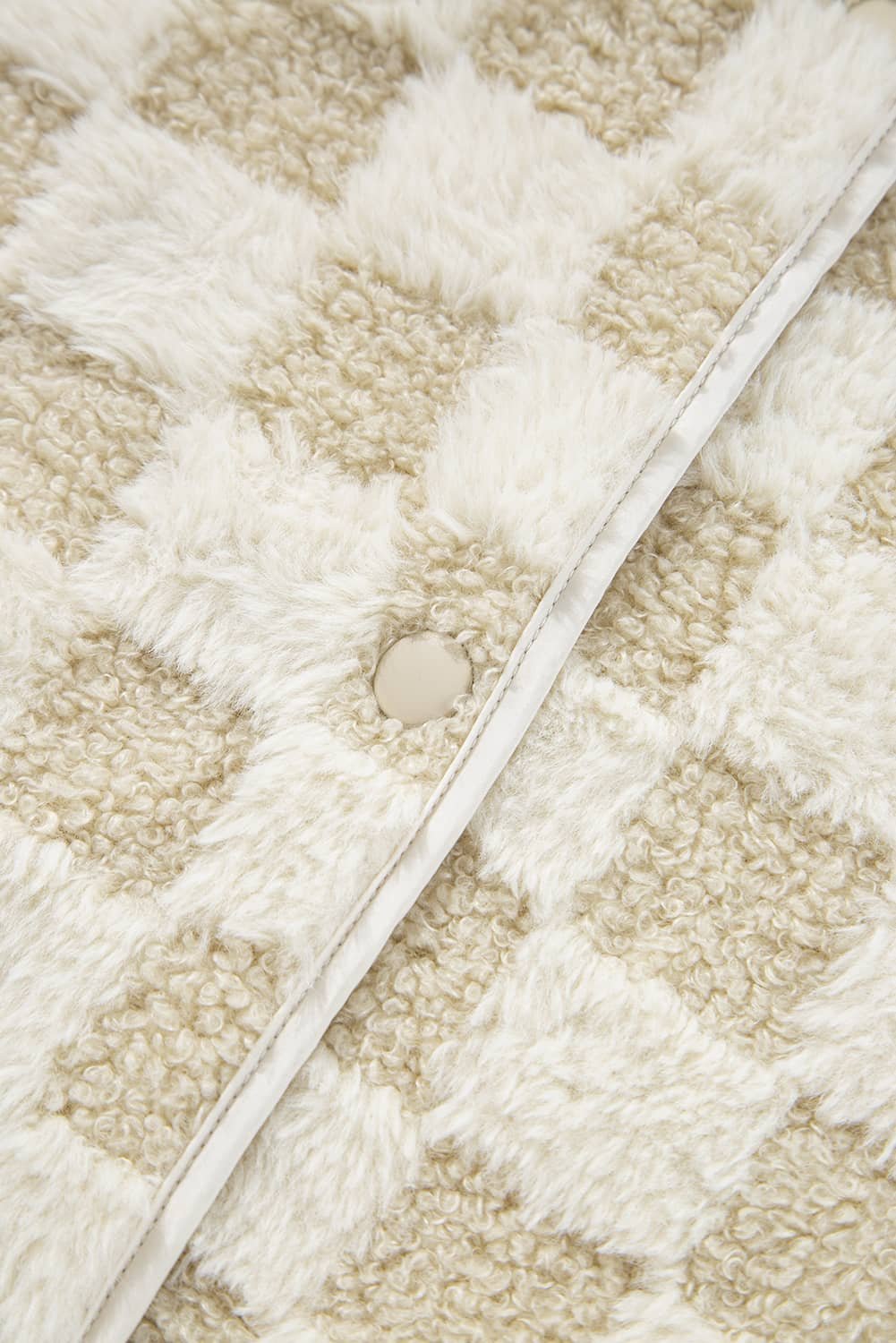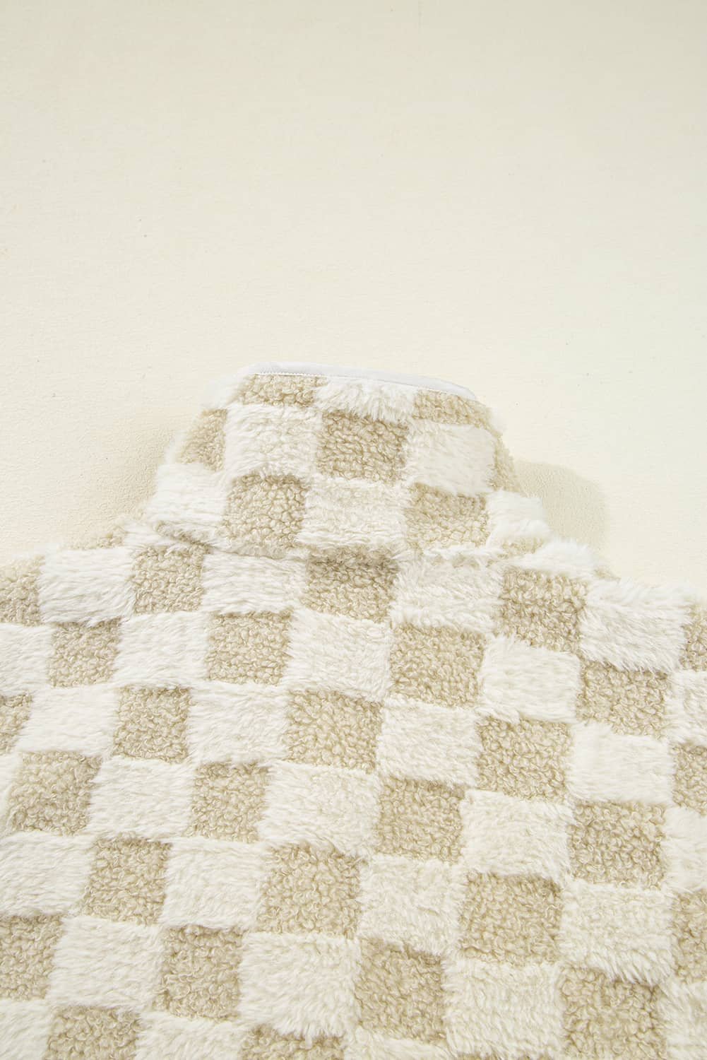 Khaki Sherpa Checkerboard Snap Button Vest Jacket With Pocket