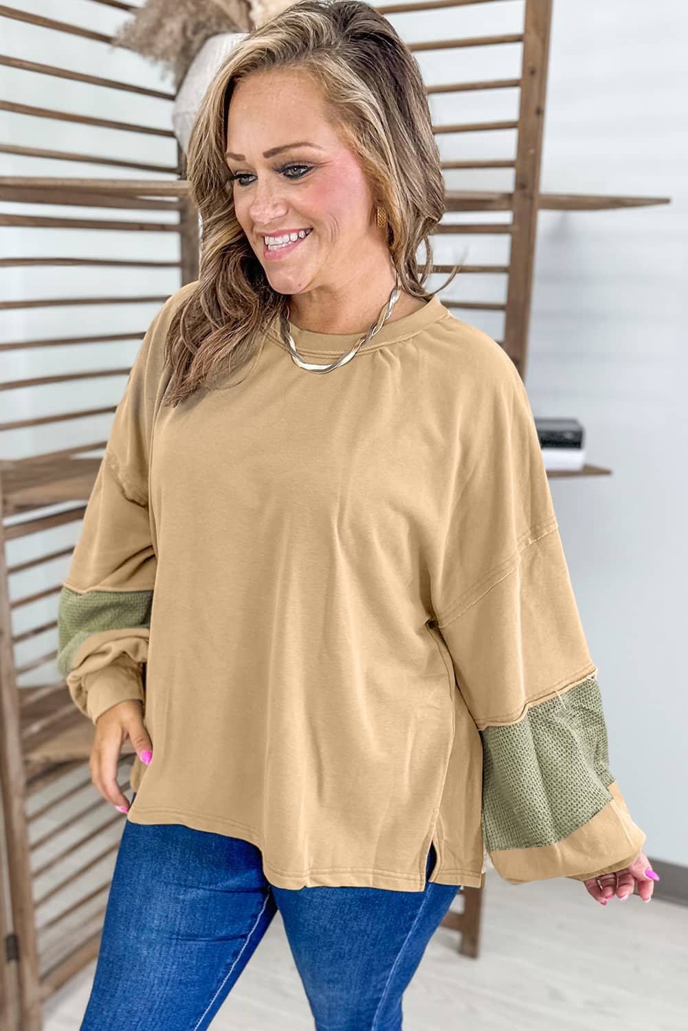 - Trendy exposed seams add edgy style to this plus size pullover.