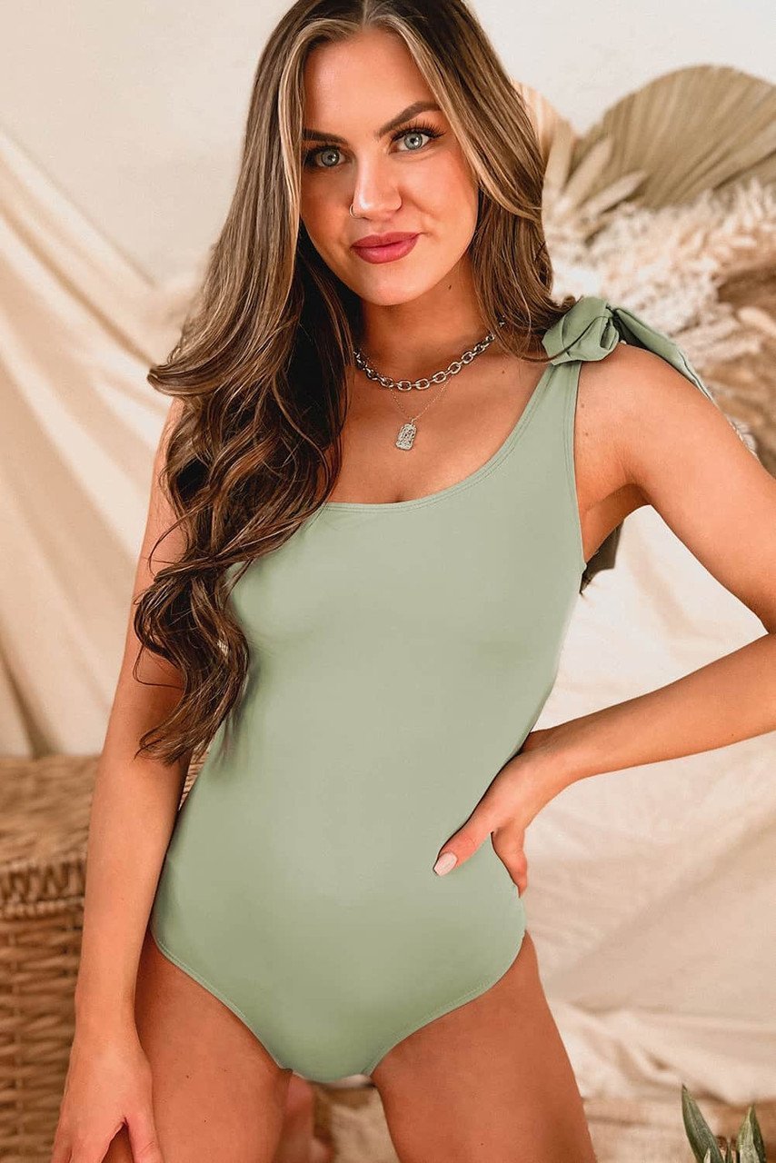 - This teddy swimwear features a flattering fit style, one-shoulder design with knotted detail