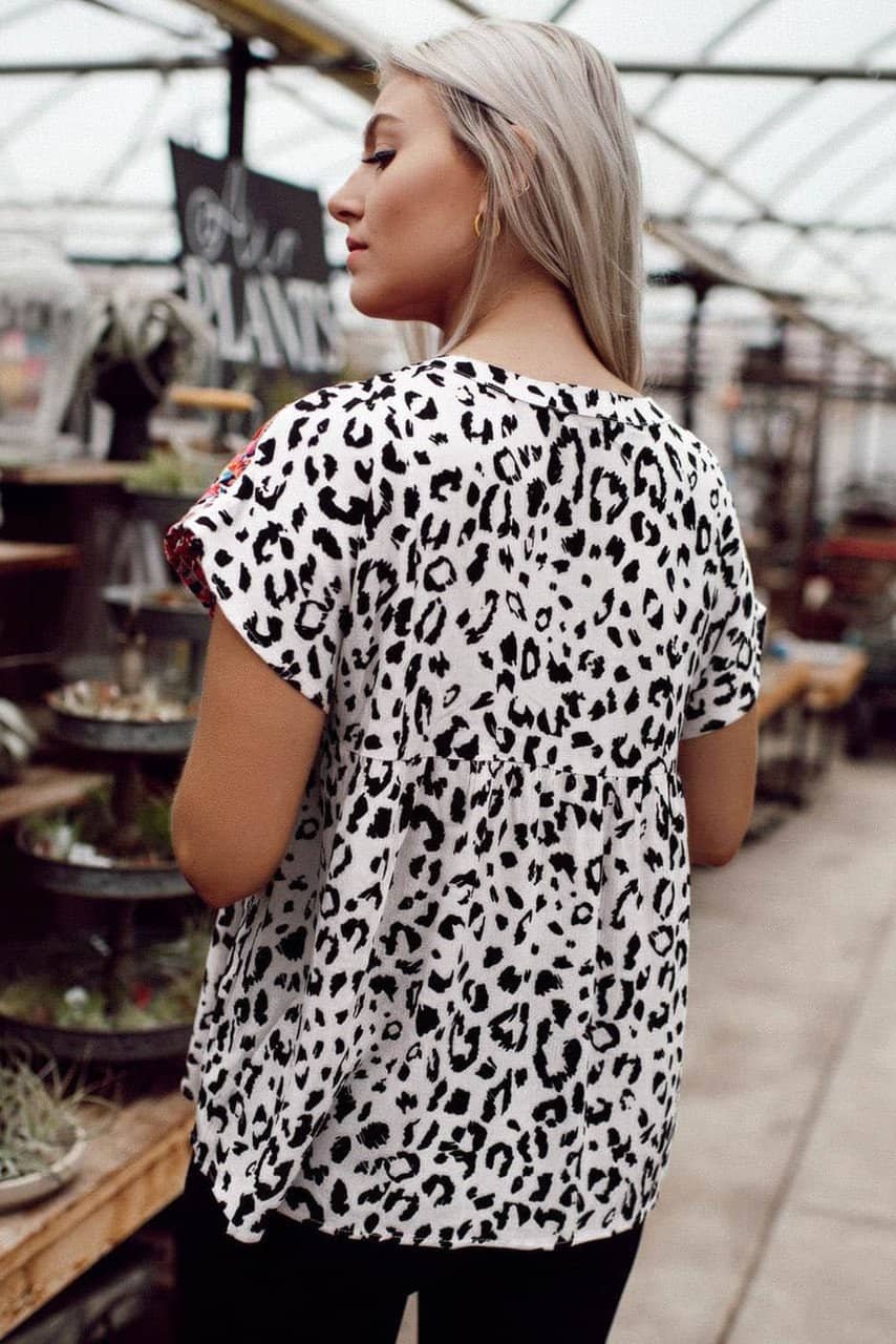 - It features a V-neck, short sleeves, chic leopard print, and a shift fit