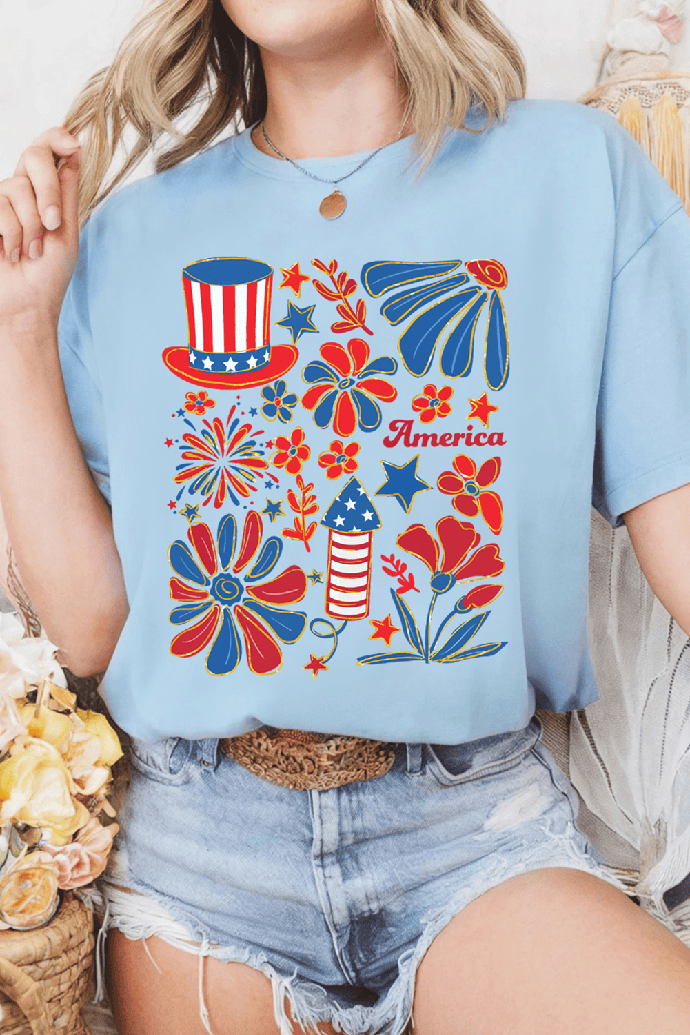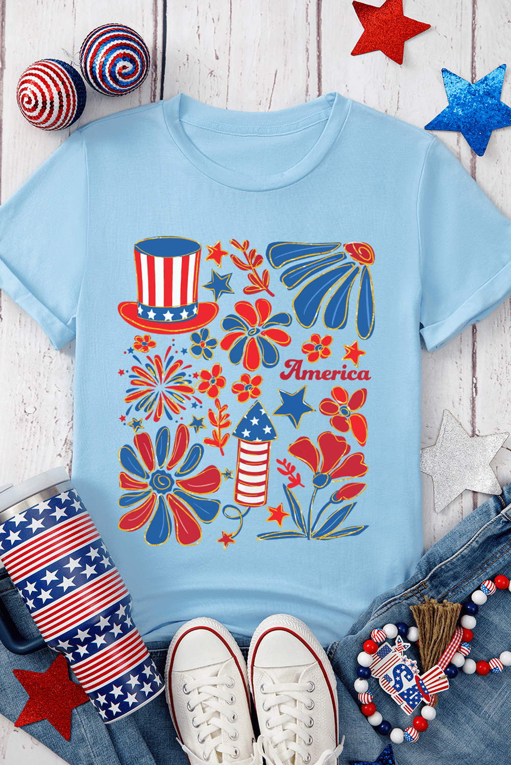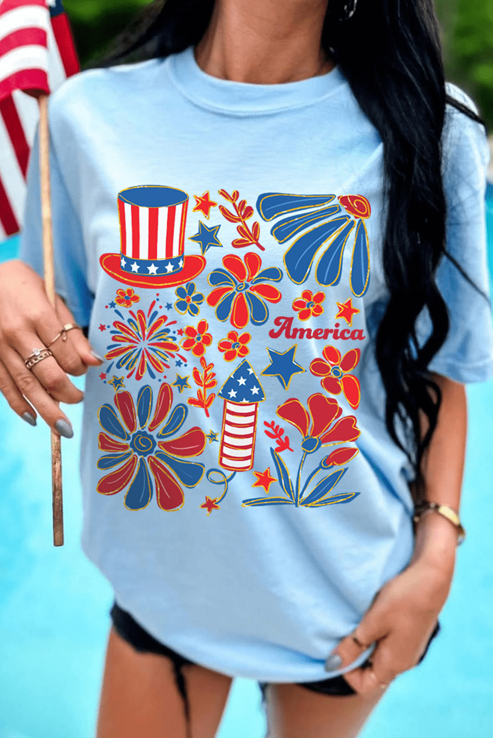 Light Blue America Floral Firework Print 4Th Of July T Shirt