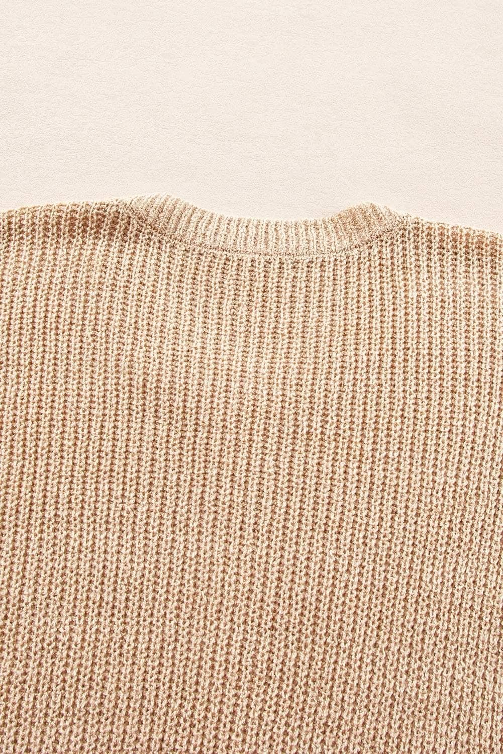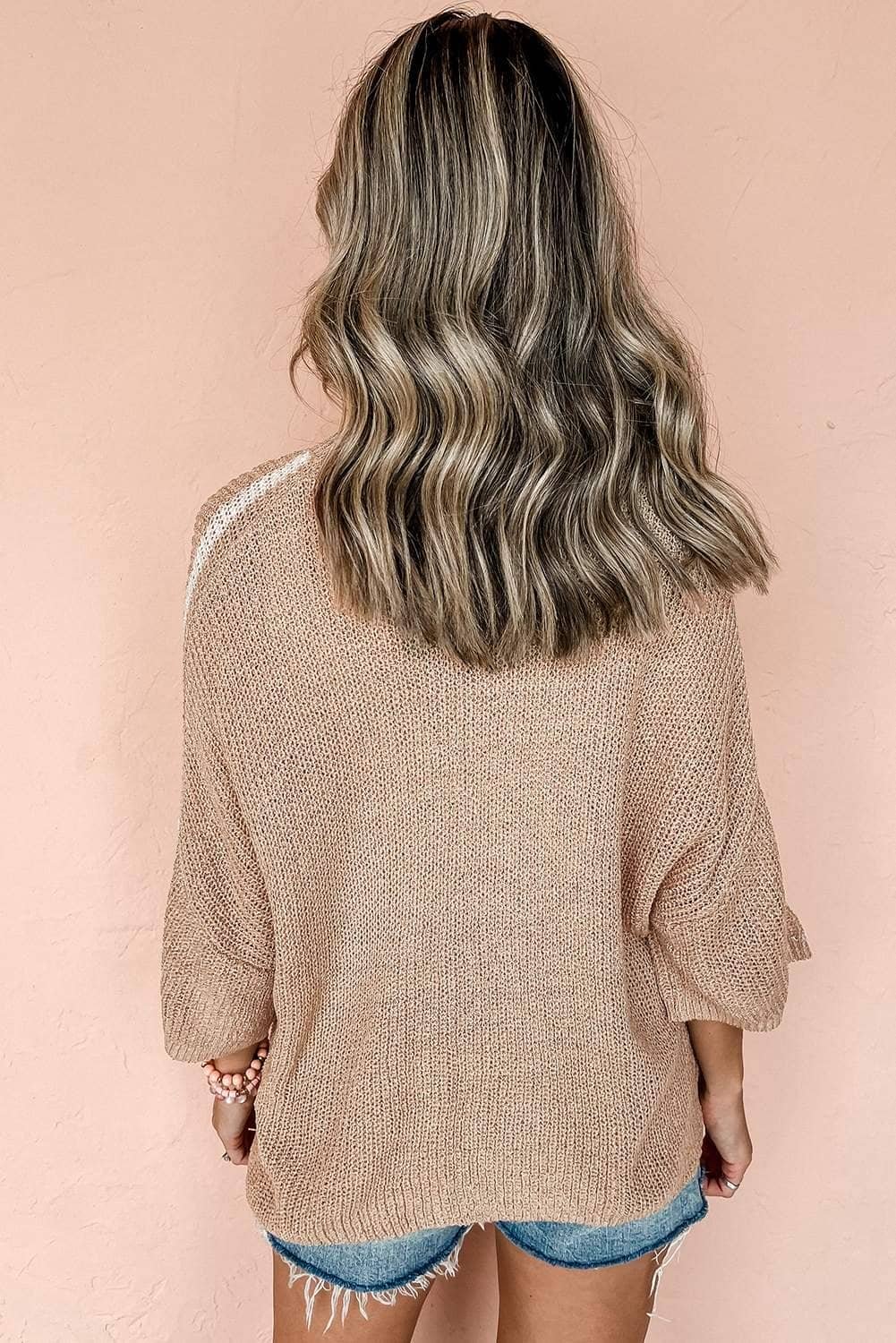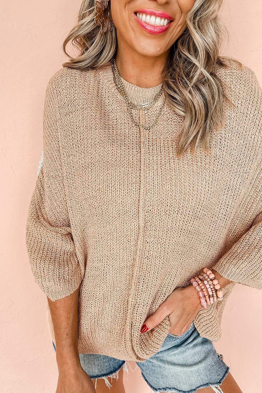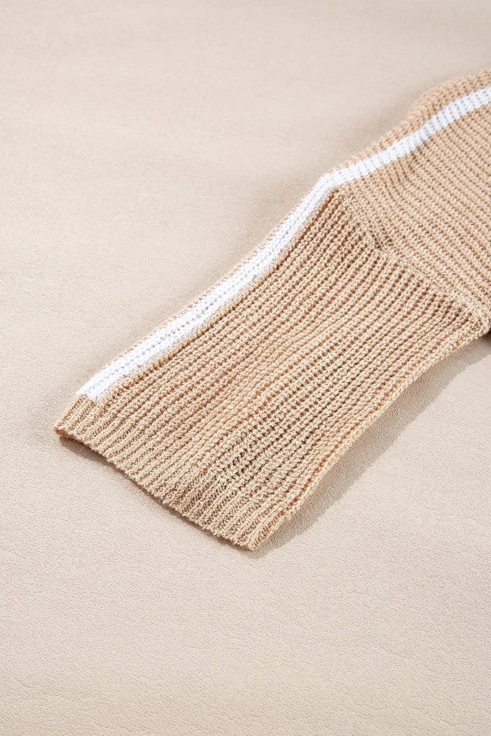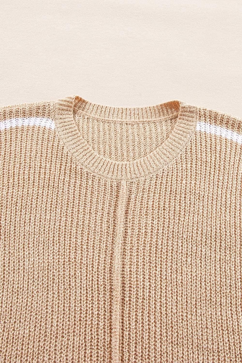 Light French Beige Contrast Striped 3/4 Sleeve Crew Neck Sweater