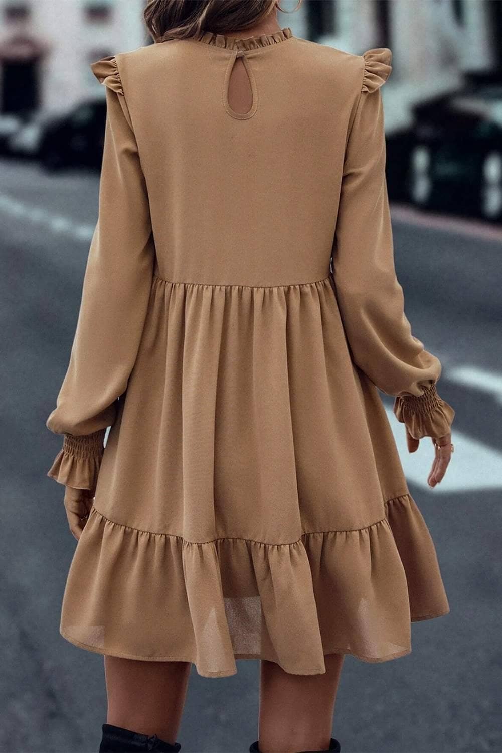 - The frilled collar adds a sophisticated touch to the solid dress.