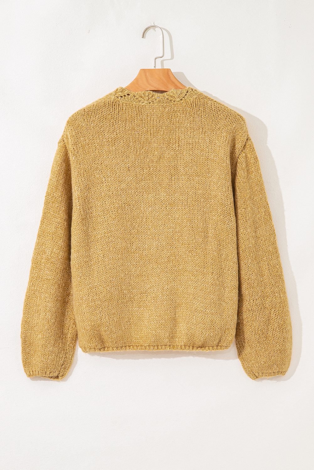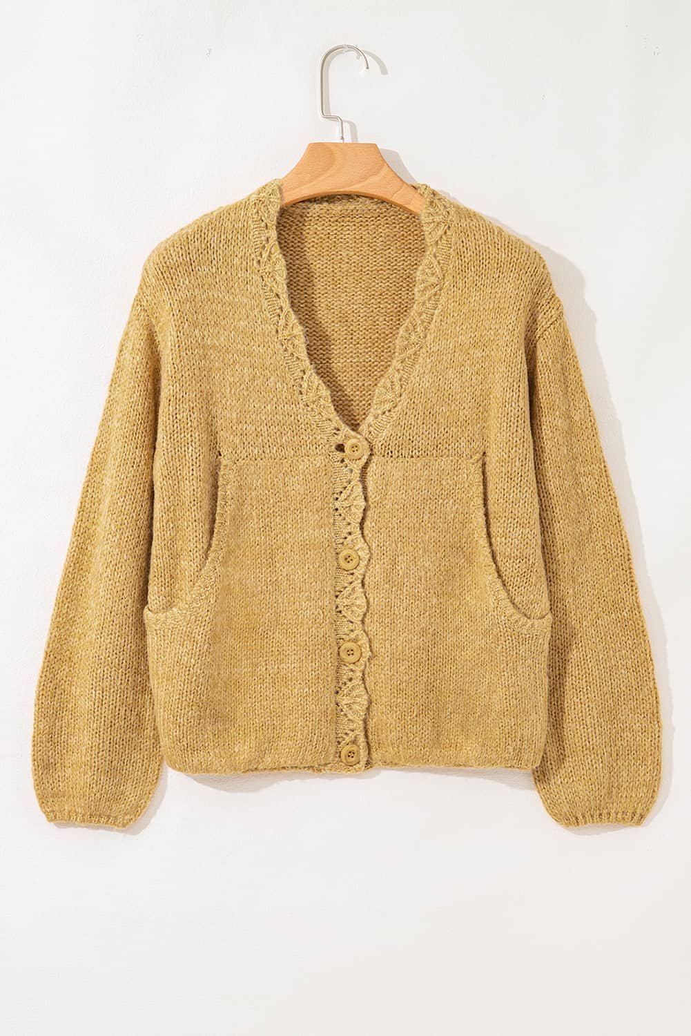 Light French Beige Lantern Sleeve Scallop V Neck Buttoned Front Cardigan