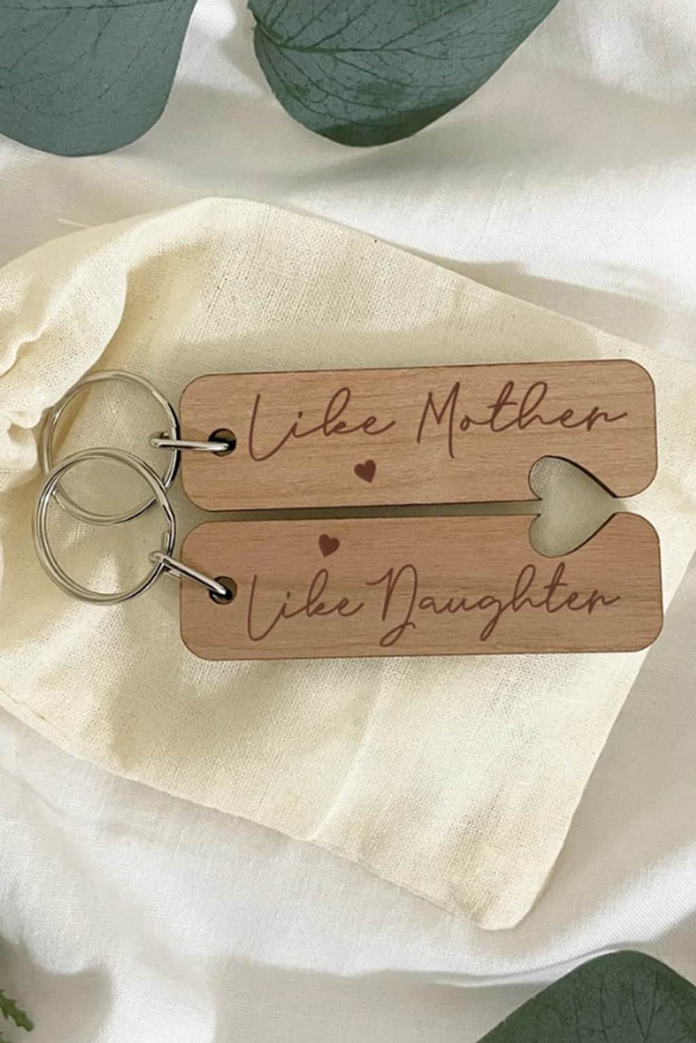 A pair of matching wooden pendants says “Like Mother” “Like Daughter”