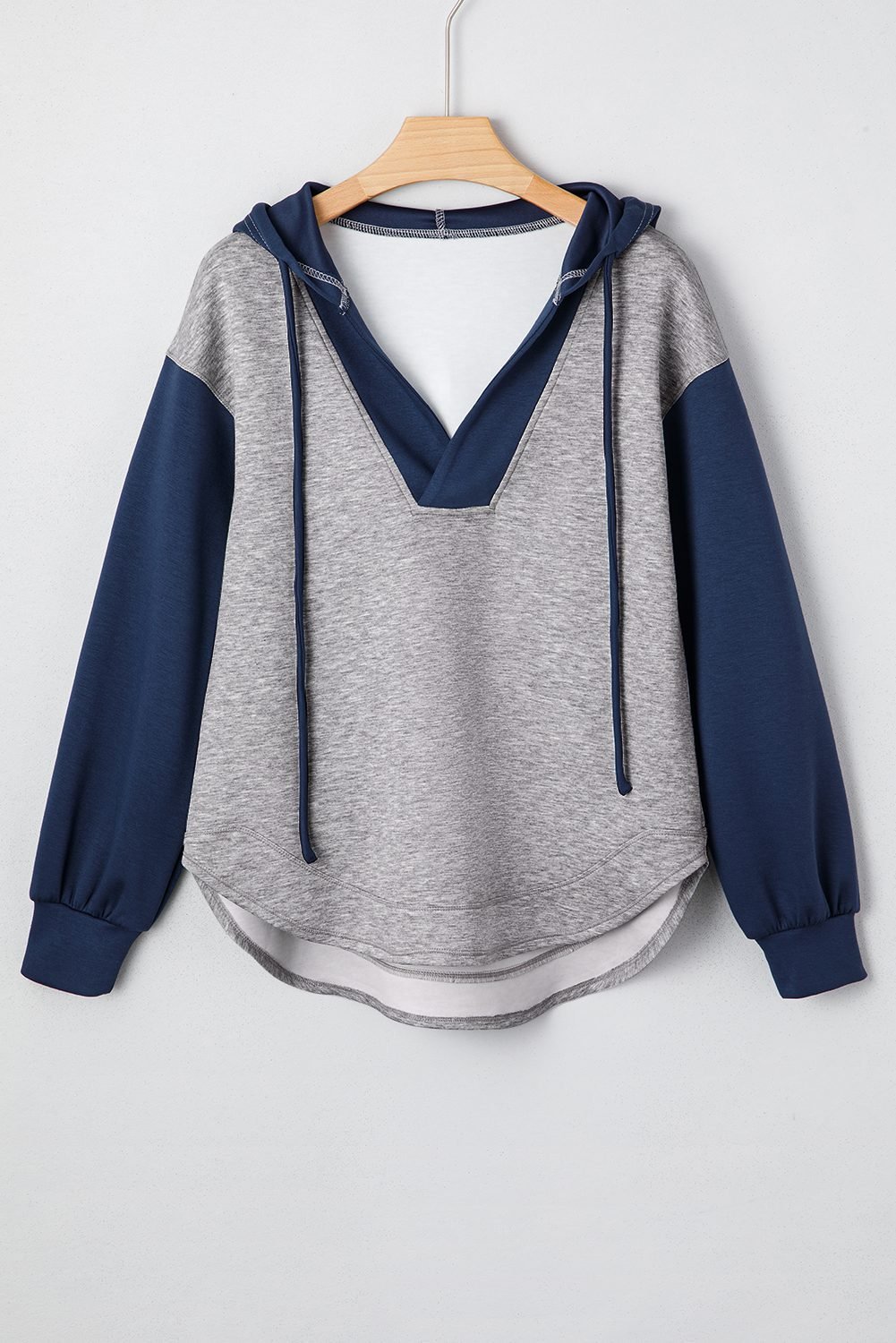 It features a contrast neckline, drop shoulder and hood patchwork.