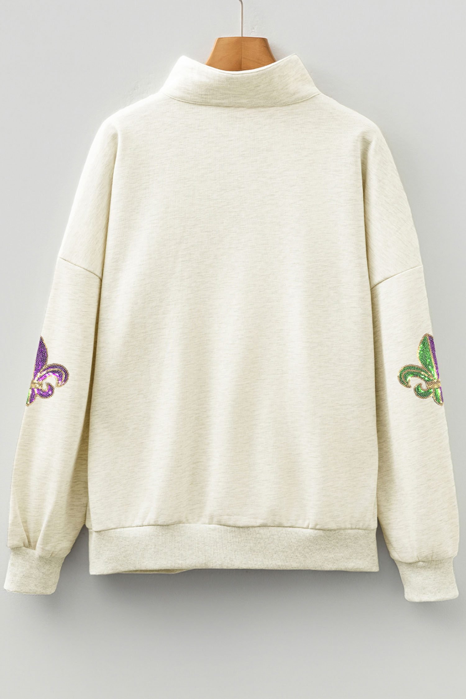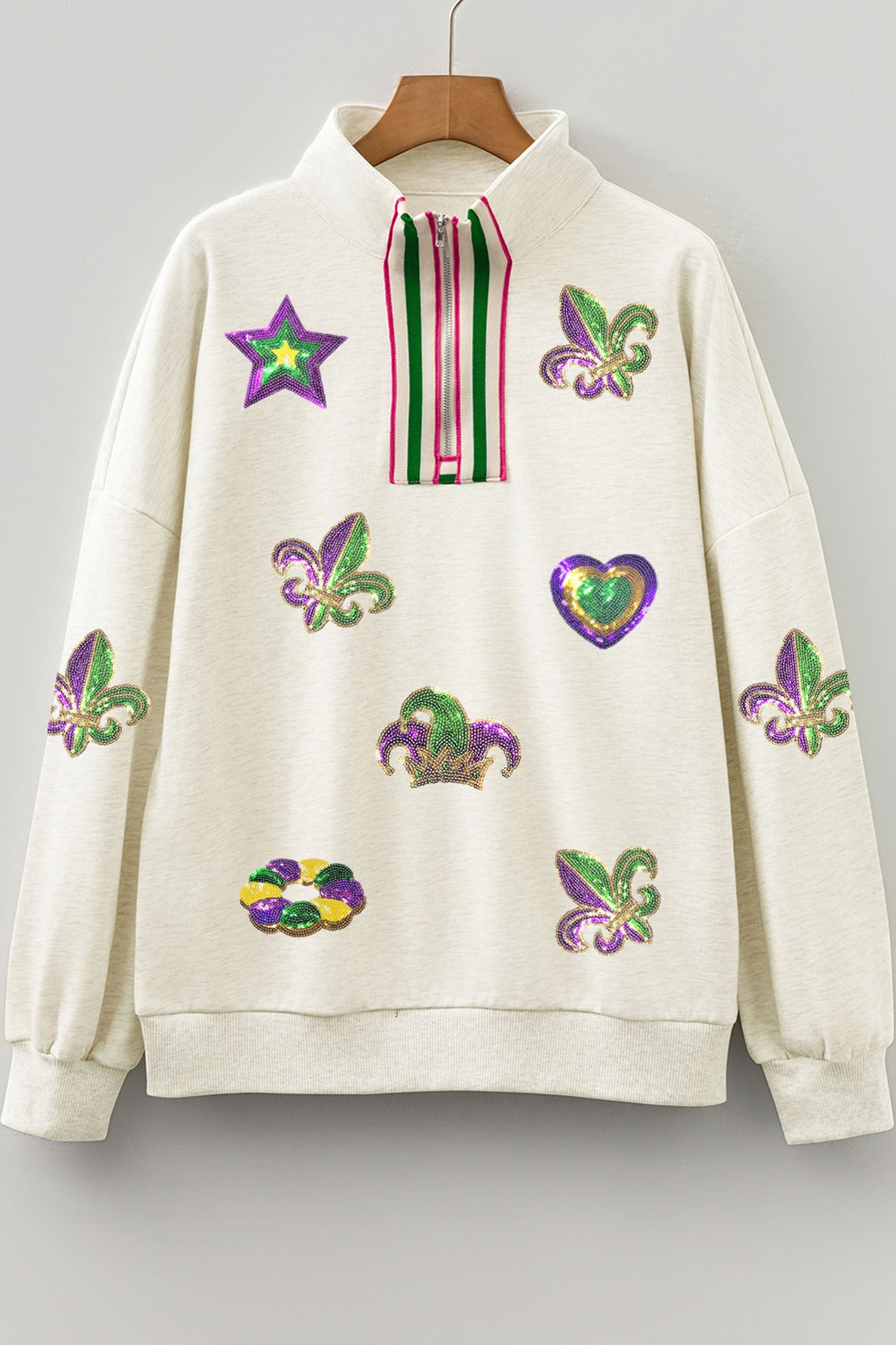 Show a unique Mardi Gras look in this graphic sweatshirt.