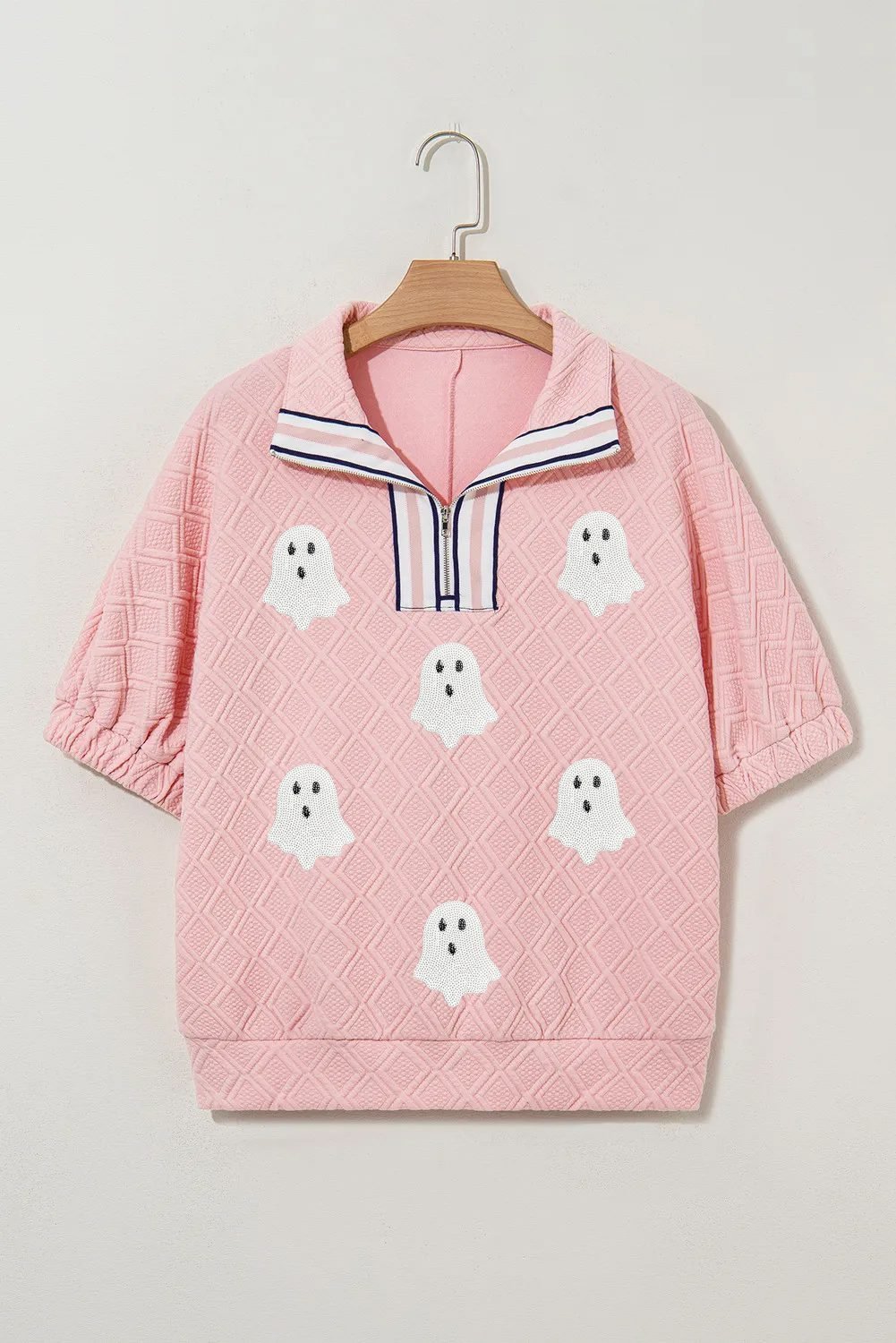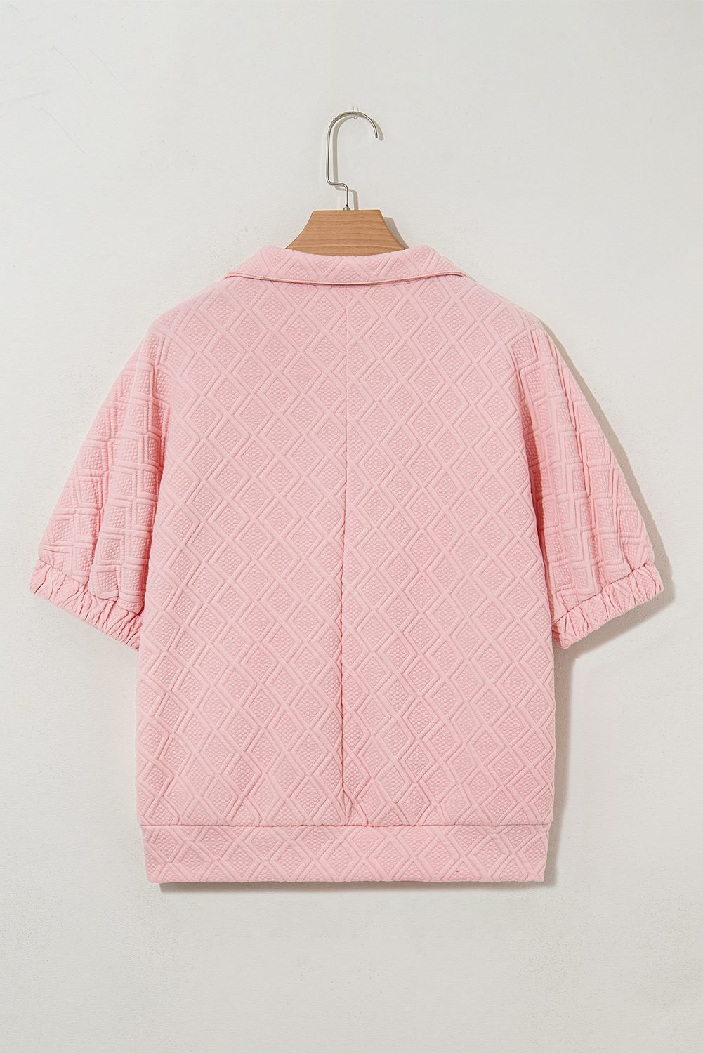Short sleeve top for women that has a contrasted patchwork at the neck.
