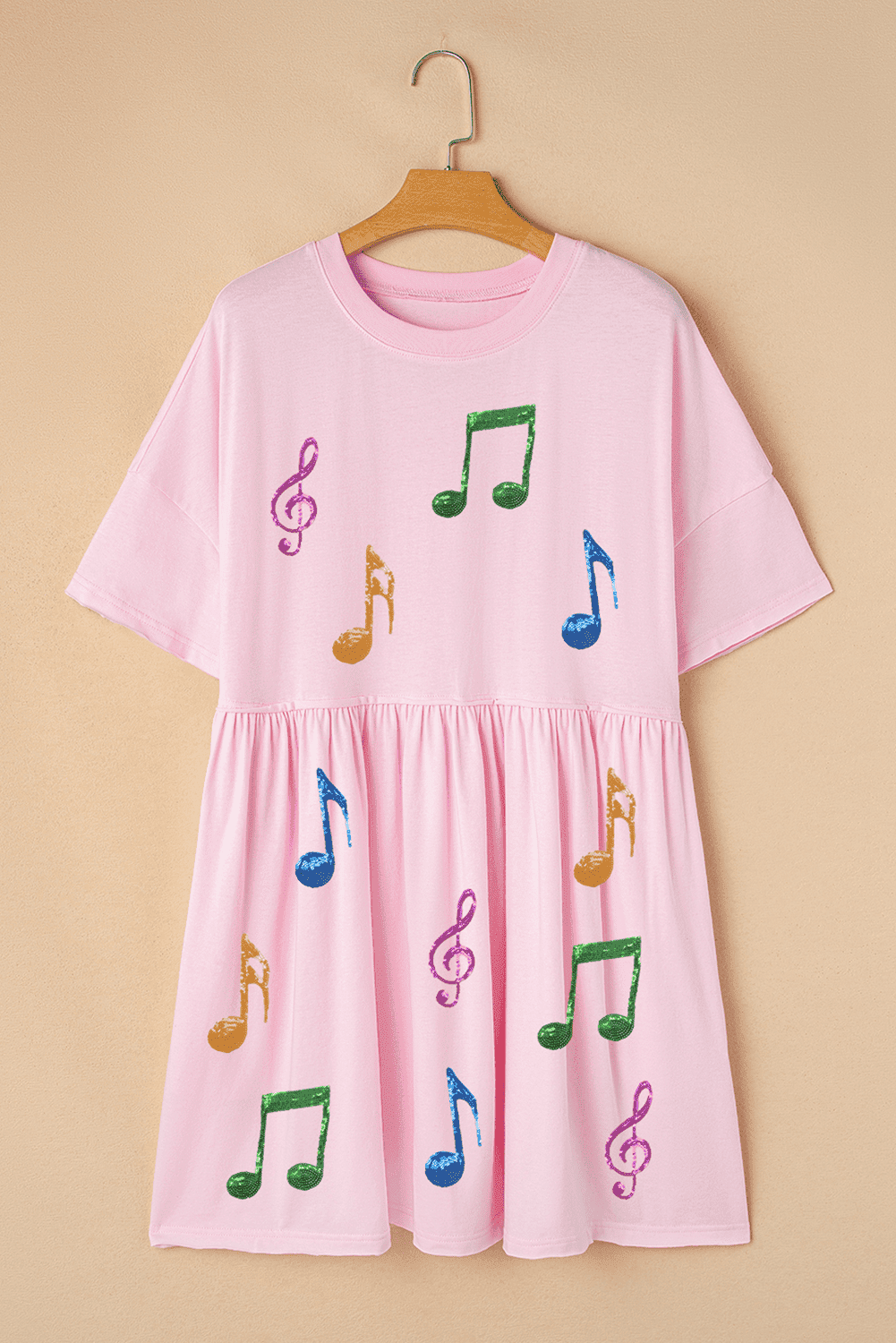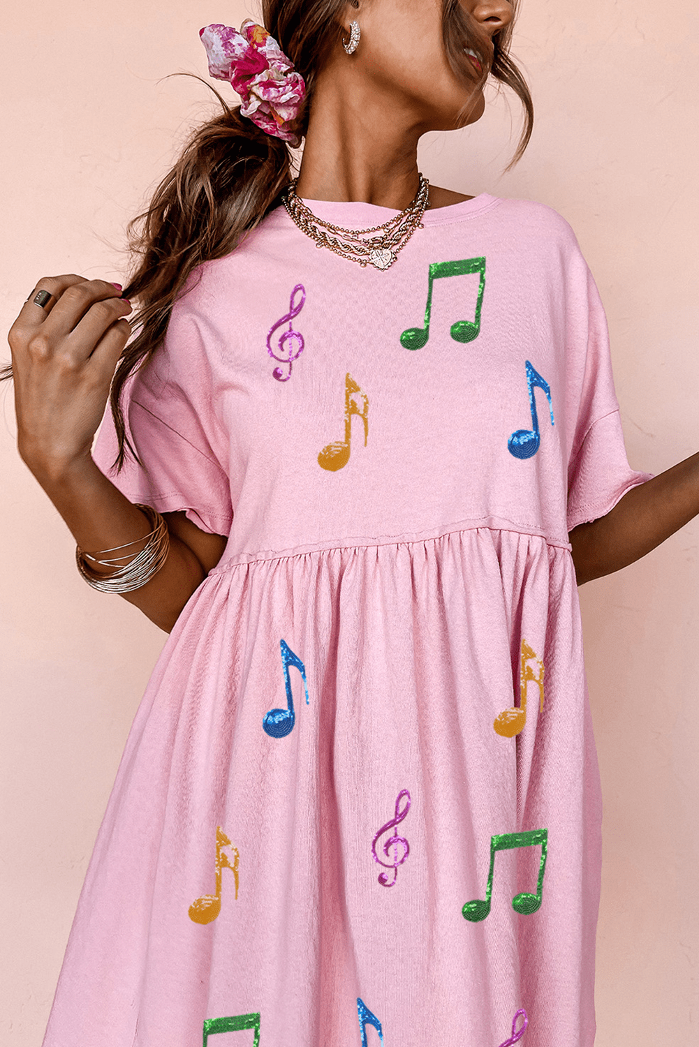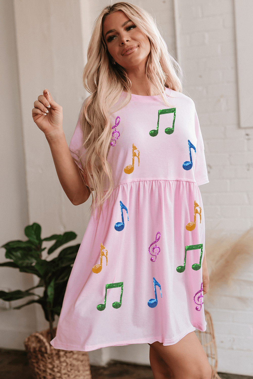- Colorful sequined note patterns on the babydoll dress are perfect for music festivals.