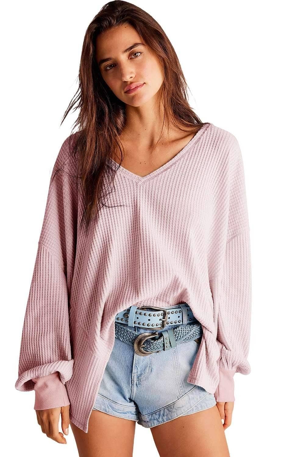 Be the first to review “Light Pink Waffle V Neck Long Sleeve Drop Shoulder Loose Blouse”
