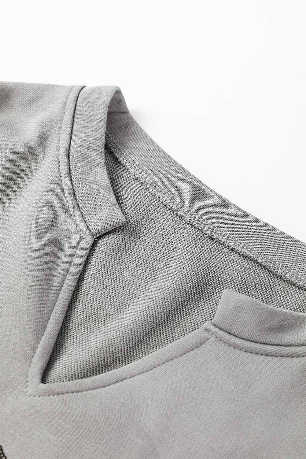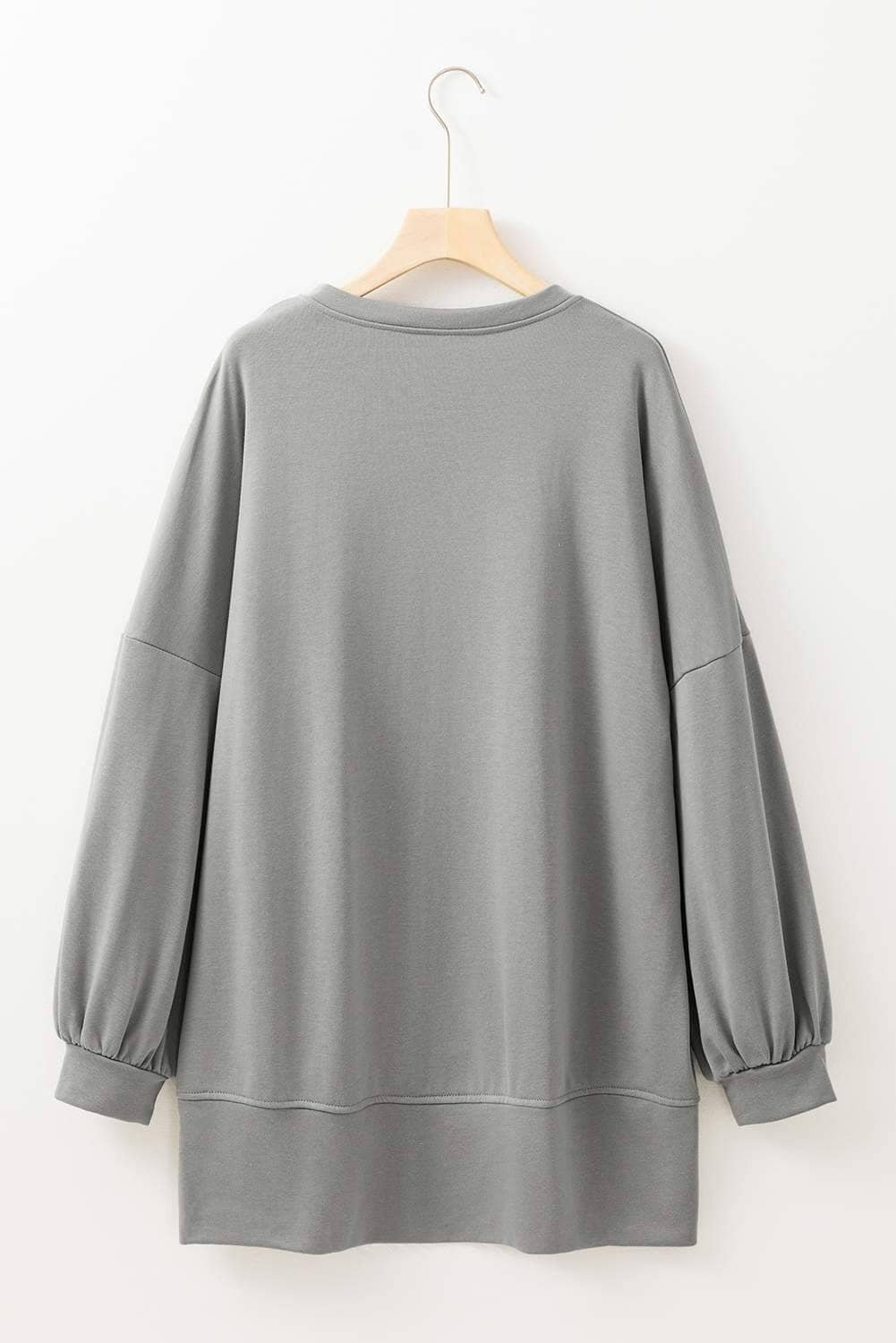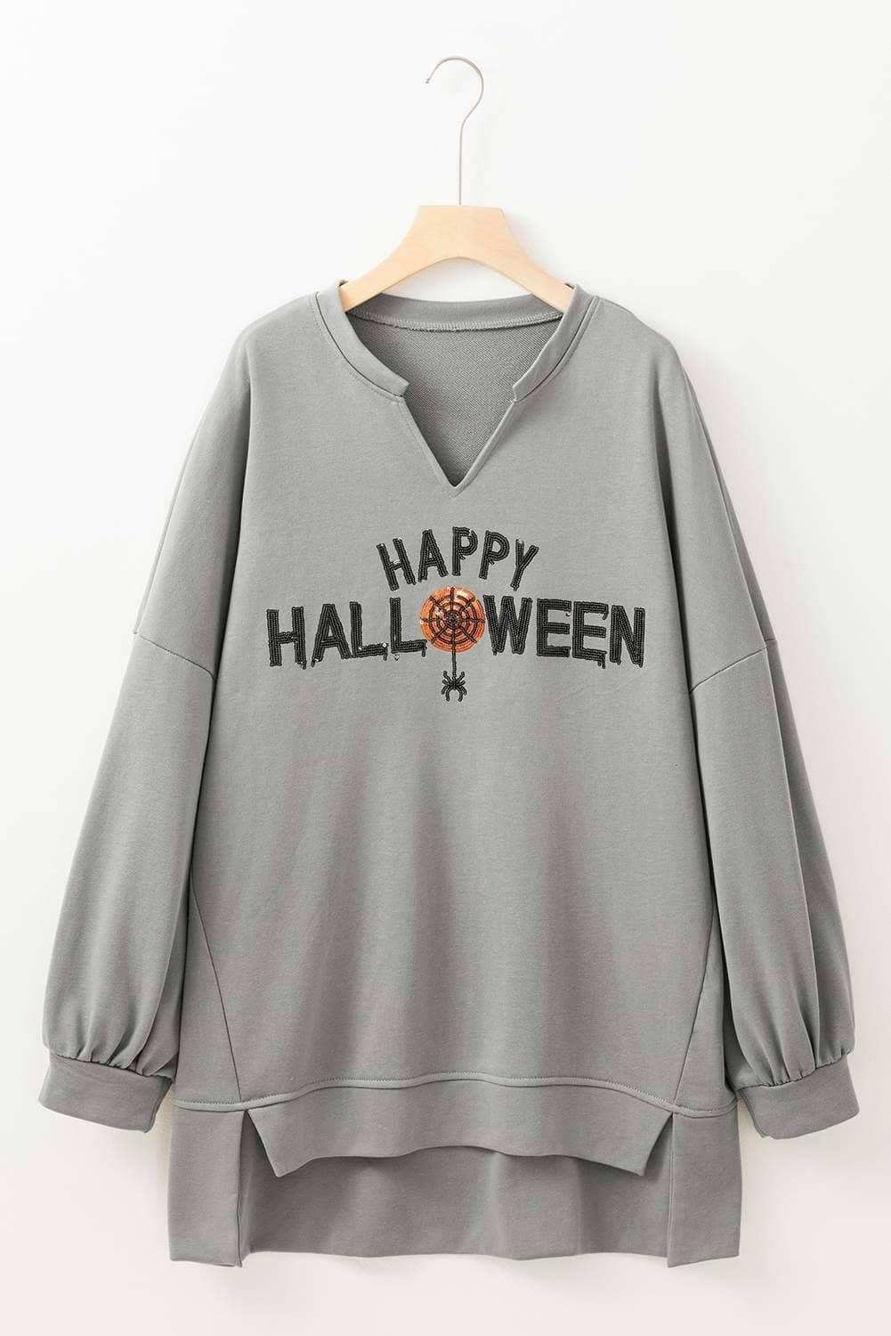 Be the first to review “Medium Grey Sequin Happy Halloween Graphic Notched Neck Long Sleeve Loose Top”