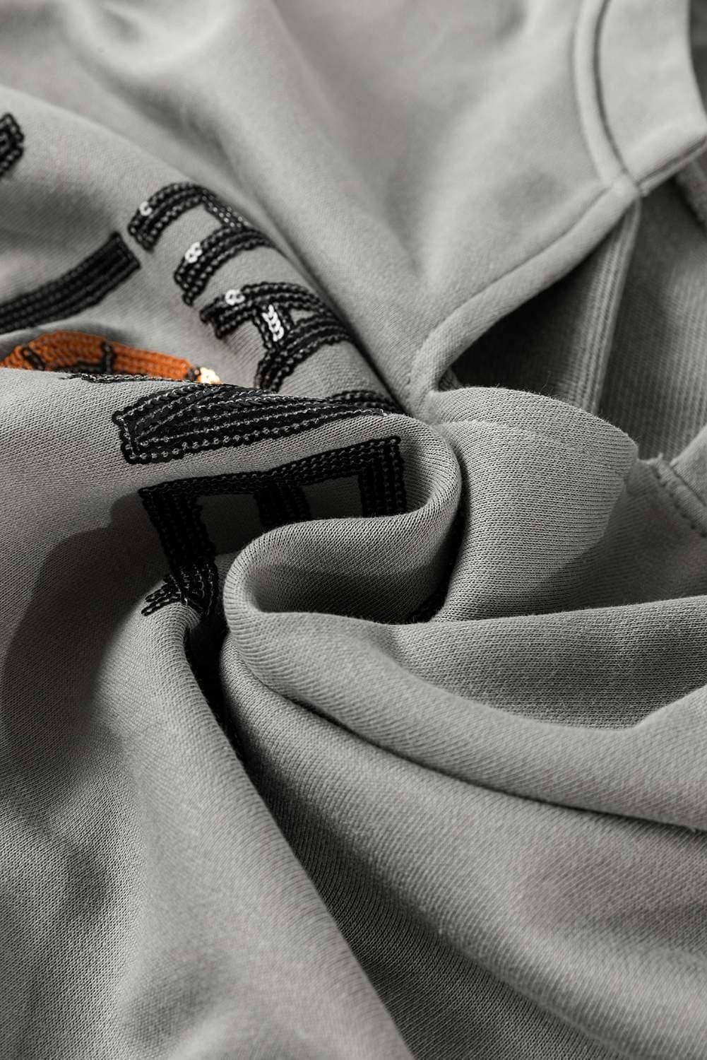 Medium Grey Sequin Happy Halloween Graphic Notched Neck Long Sleeve Loose Top