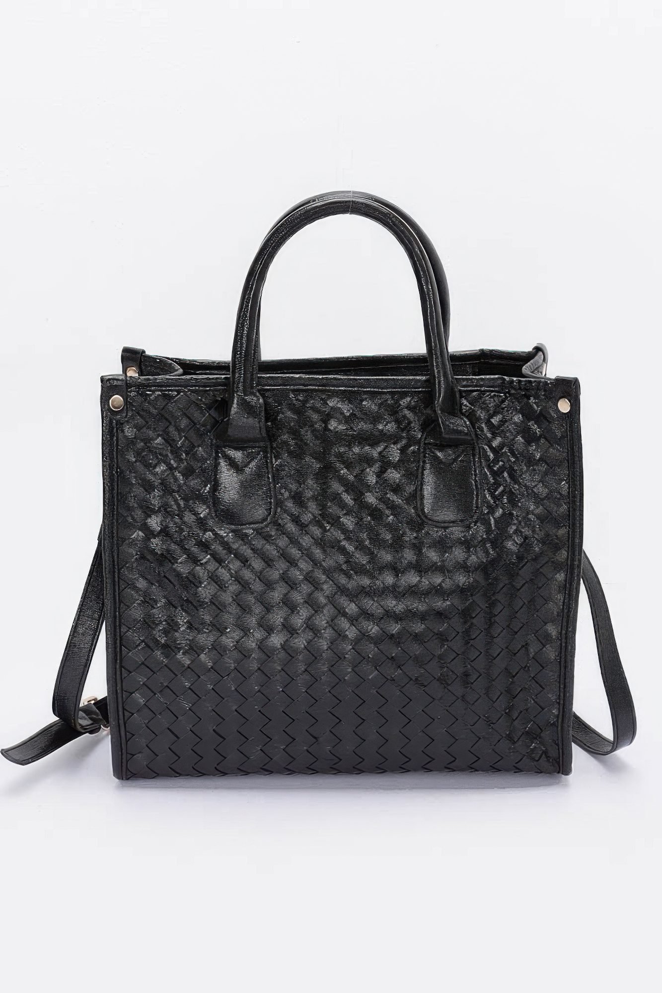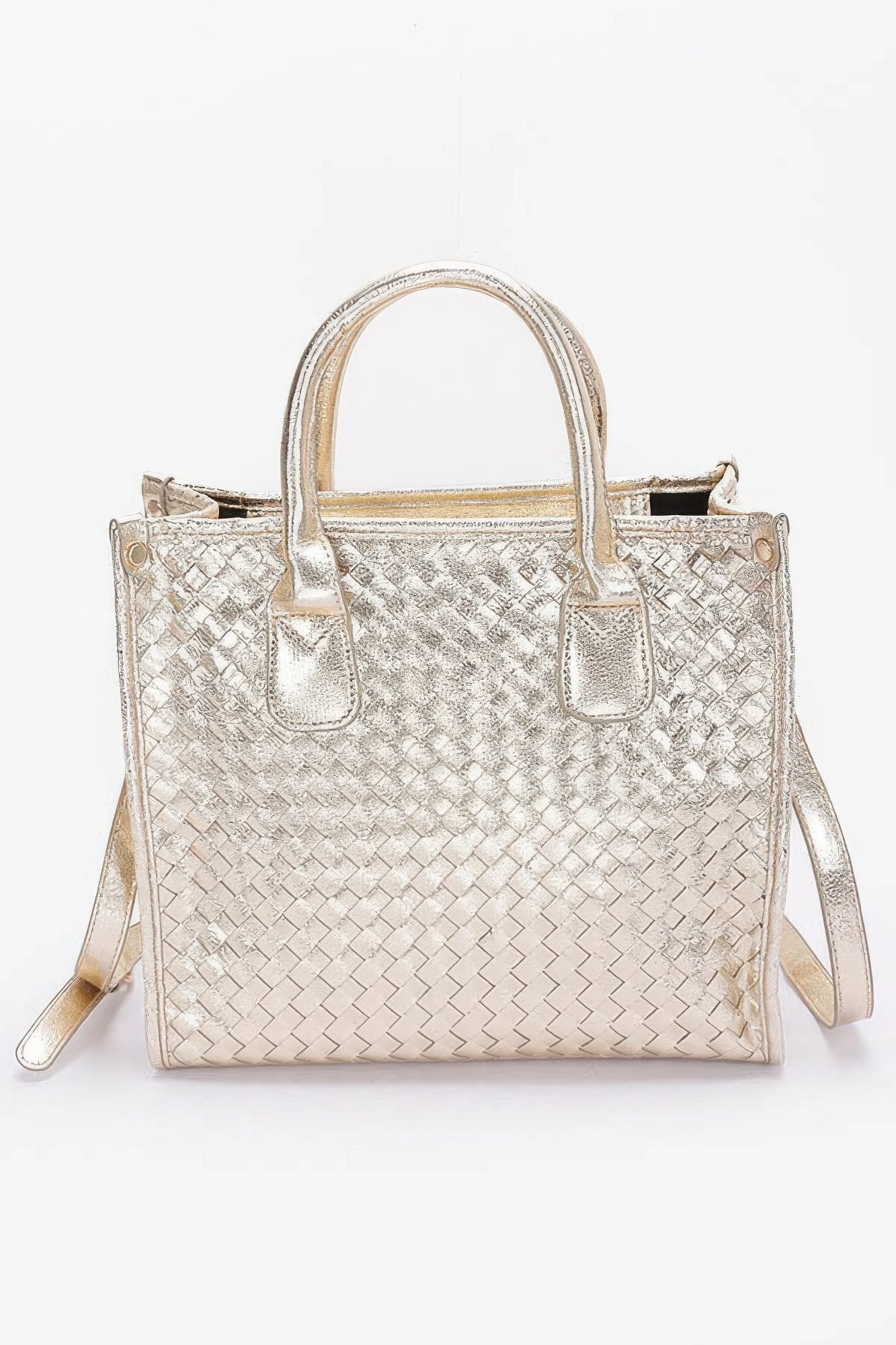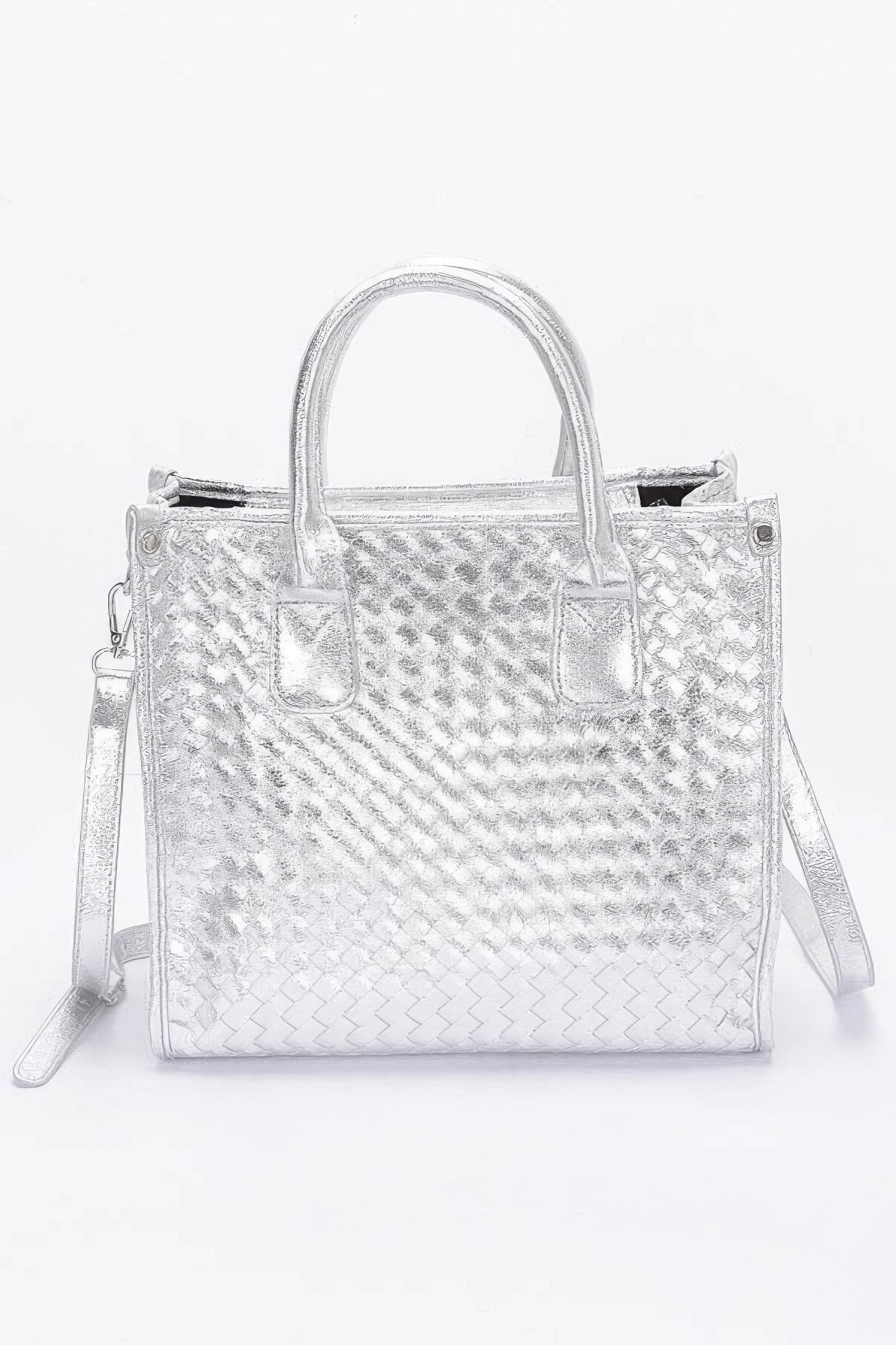 Elevate your accessory game with the Metallic Braided Tote Bag, a stylish and versatile piece designed to add a touch of sophistication to your everyday look. Whether you’re heading to the office, a weekend getaway, or an evening out, this tote is the perfect blend of functionality and fashion. Key Features: Fabric: Made with high-quality polyurethane and mixed metal materials, offering durability with a metallic finish that shines. Fit: 11.5W x 10H x 5D, providing ample space for your essentials while maintaining a sleek, stylish shape. Color Options: Black, Gold, Silver Sizes: One size Design: The braided metallic design adds texture and dimension, making this tote a standout piece. The sturdy handles and spacious interior make it both fashionable and practical. Versatile Styling: Whether you’re dressing up for a special occasion or carrying it casually day-to-day, this tote bag easily complements any outfit, adding a chic touch to your look. Product Details: Comfortable All-Day Wear: The ergonomic design of the handles ensures comfort, even when carrying the bag for long periods. Quality Craftsmanship: The high-quality materials used in the Metallic Braided Tote Bag ensure its durability while maintaining its glamorous metallic shine. Why Choose Metallic Braided Tote Bag This tote is perfect for those who want to make a statement with their accessories. The metallic finish and braided design create a unique, eye-catching piece that stands out while offering the practical features of a spacious tote. Ideal Occasions: Perfect for daily use, weekend trips, or evening events, this tote bag can carry everything you need while adding a stylish flair to any occasion.