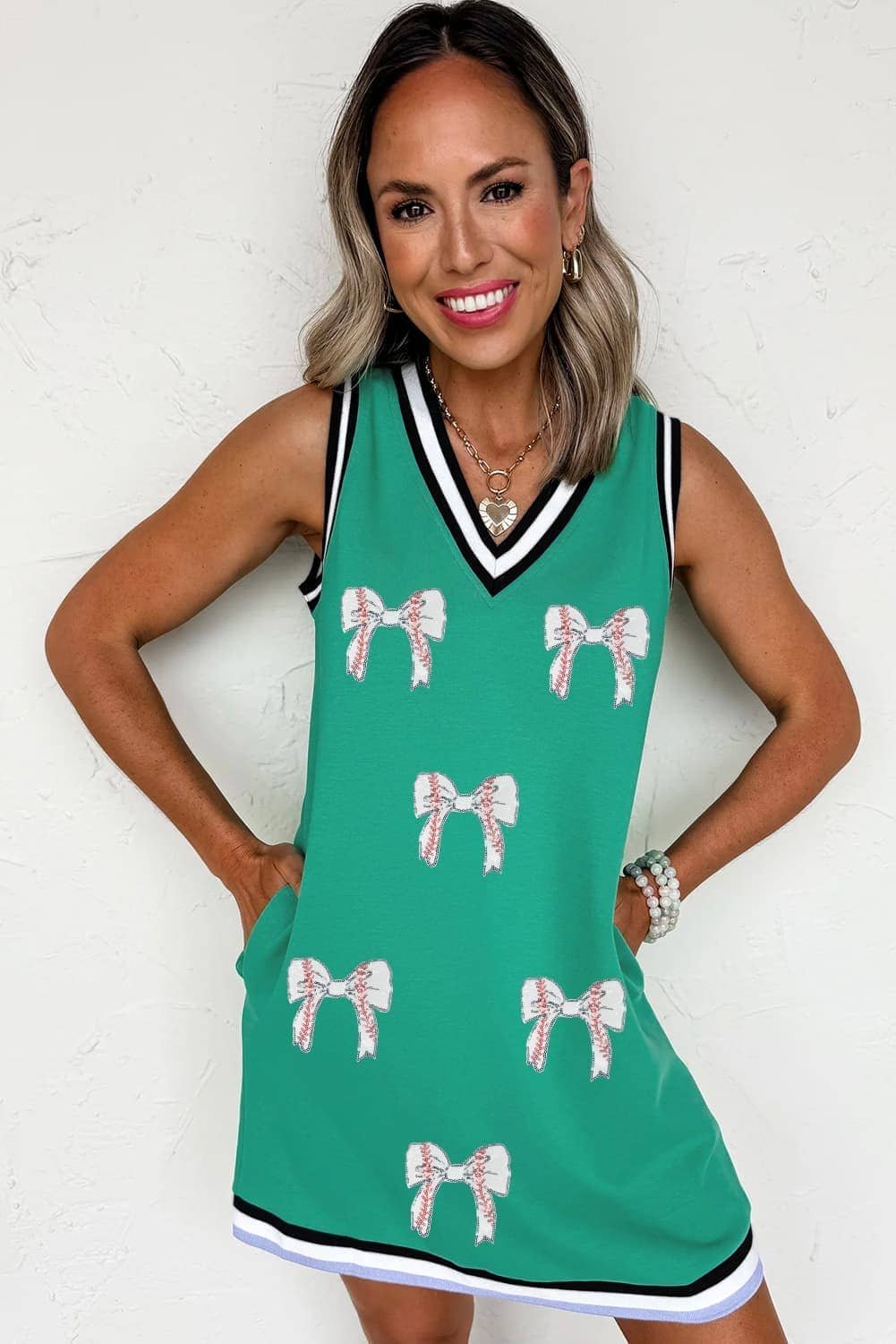 Mint Green Contrast Striped Detail Glitter Baseball Patched V Neck Tank Dress