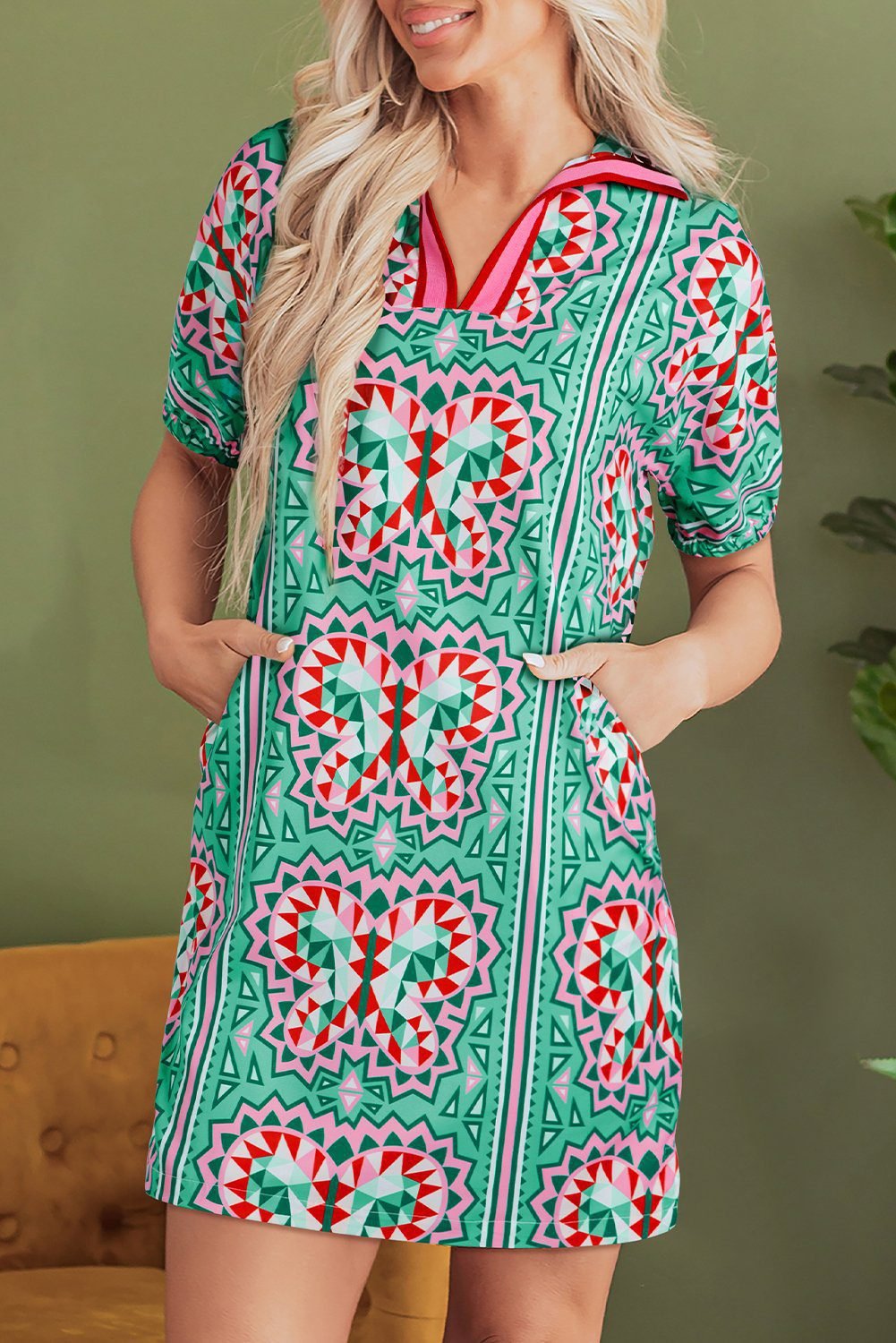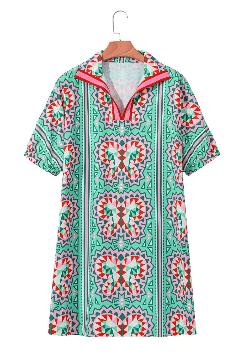 Mint Green Geometric Butterfly Print Split Neck Short Sleeve Dress