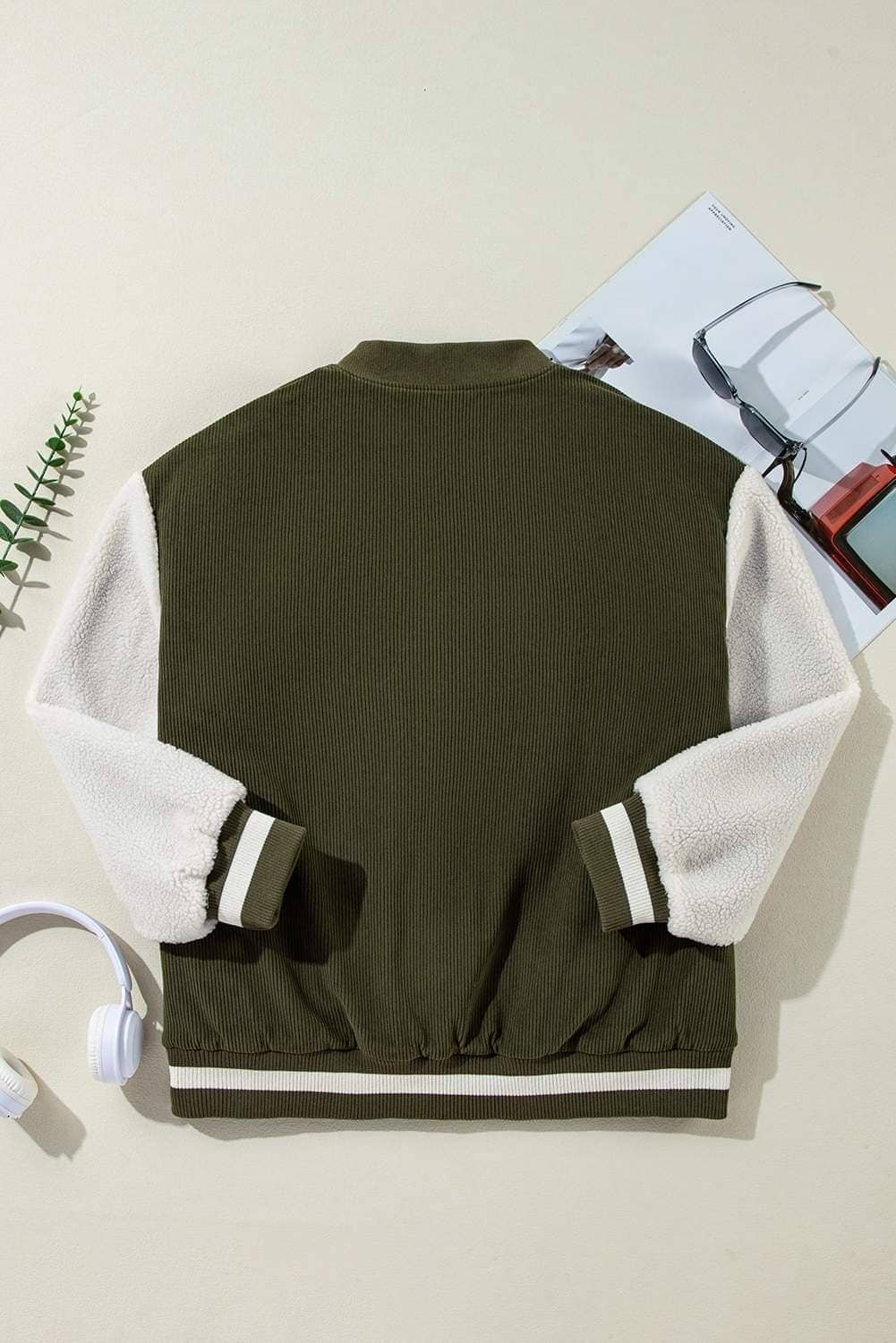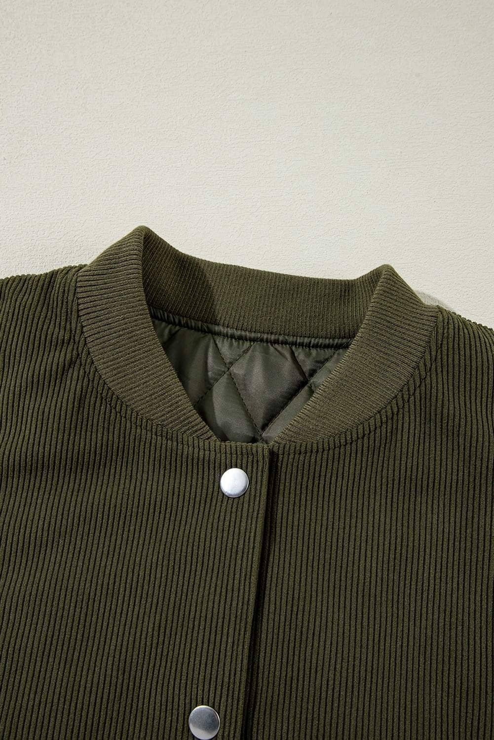 Corduroy jacket features a flat collar, varsity-striped trim, snap button-front closures.