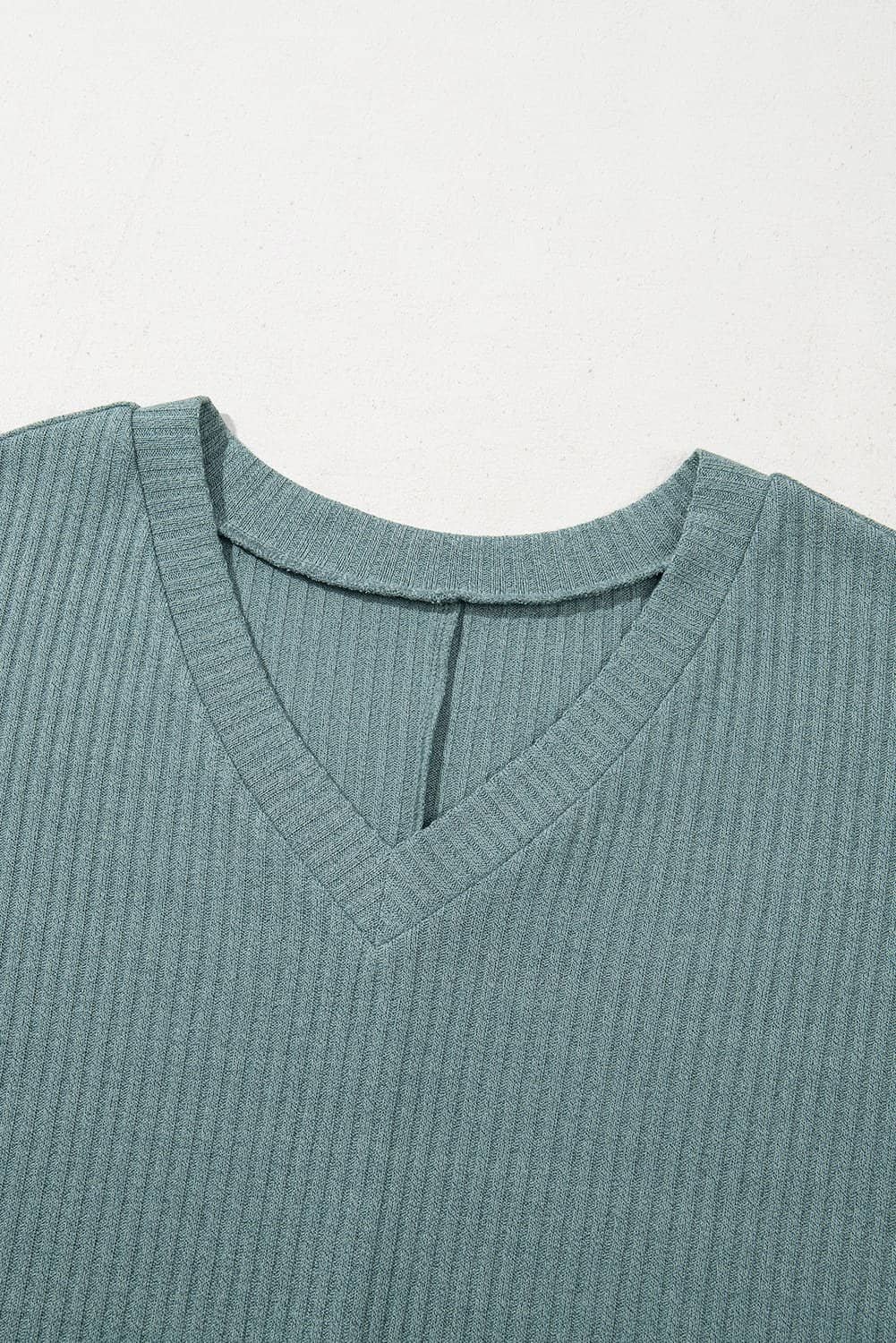 Loose and slouchy top with v neck and dolman short sleeve silhouette.