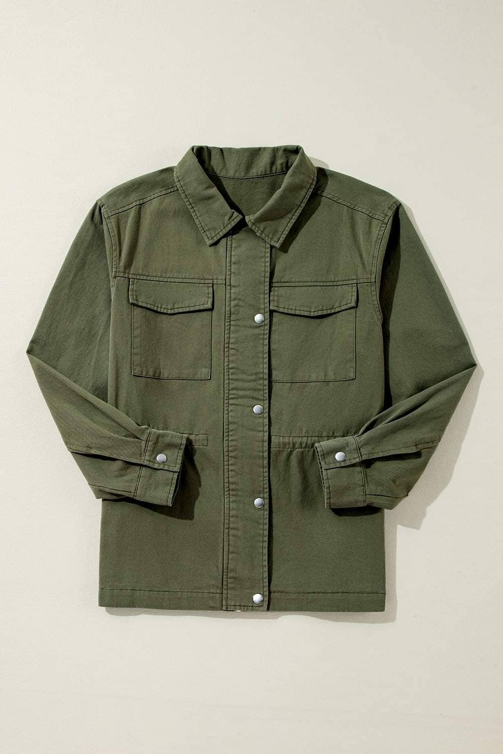 Be the first to review “Moss Green Snap Button Zipper Tight Waist Collared Jacket”