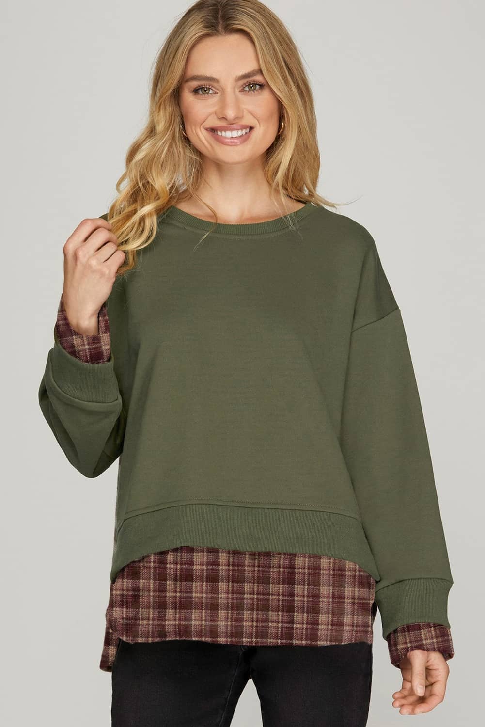 - Vintage plaid patchwork design adds retro charm to this round neck sweatshirt.