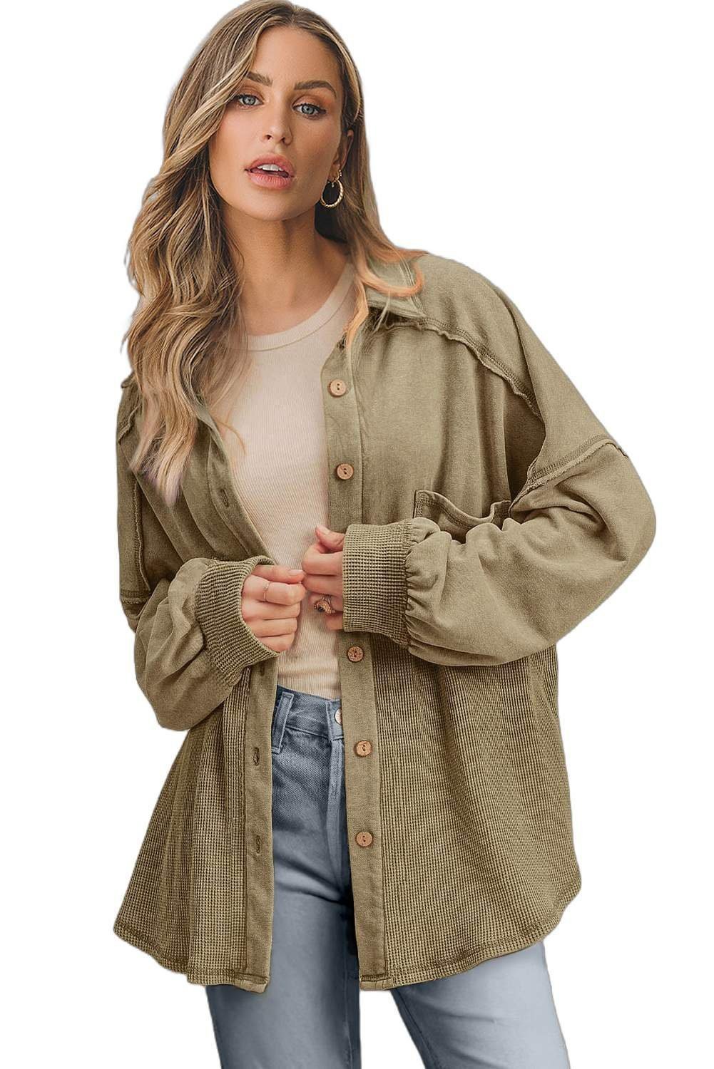 Be the first to review “Moss Green Waffle Knit Patchwork Buttoned Oversized Shacket”