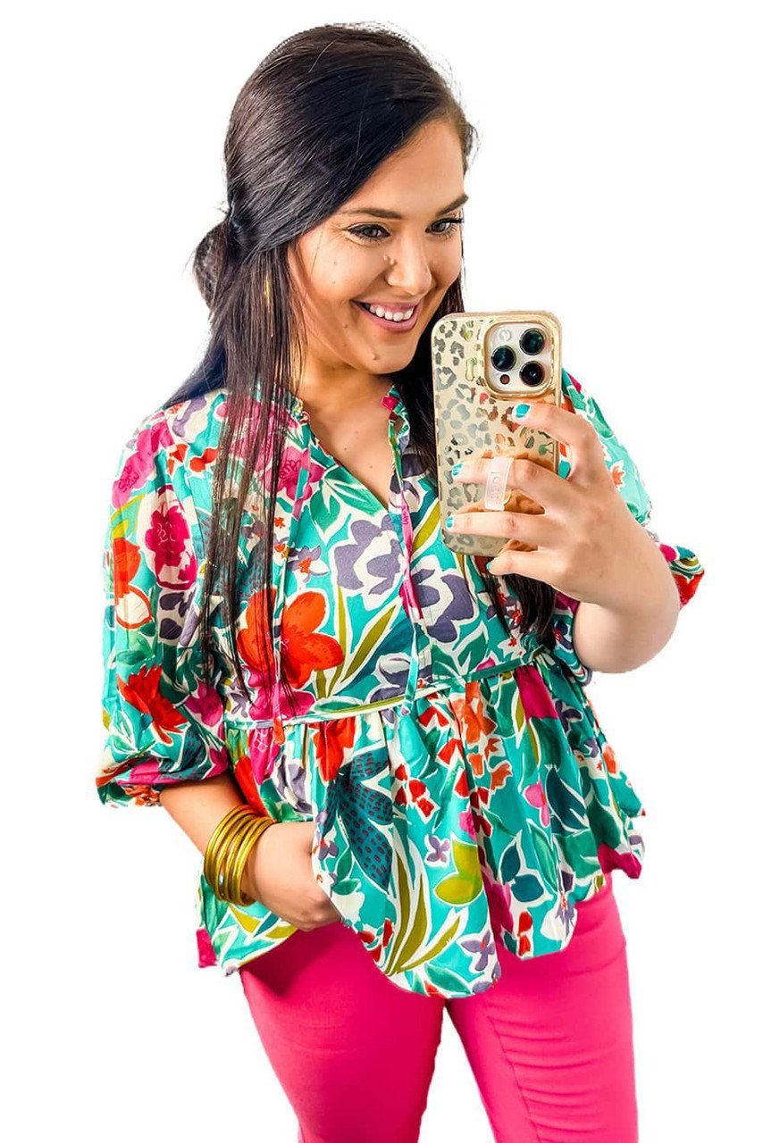 - This top has a soft feel, 3/4 length, puff sleeves, and a self-tie neckline