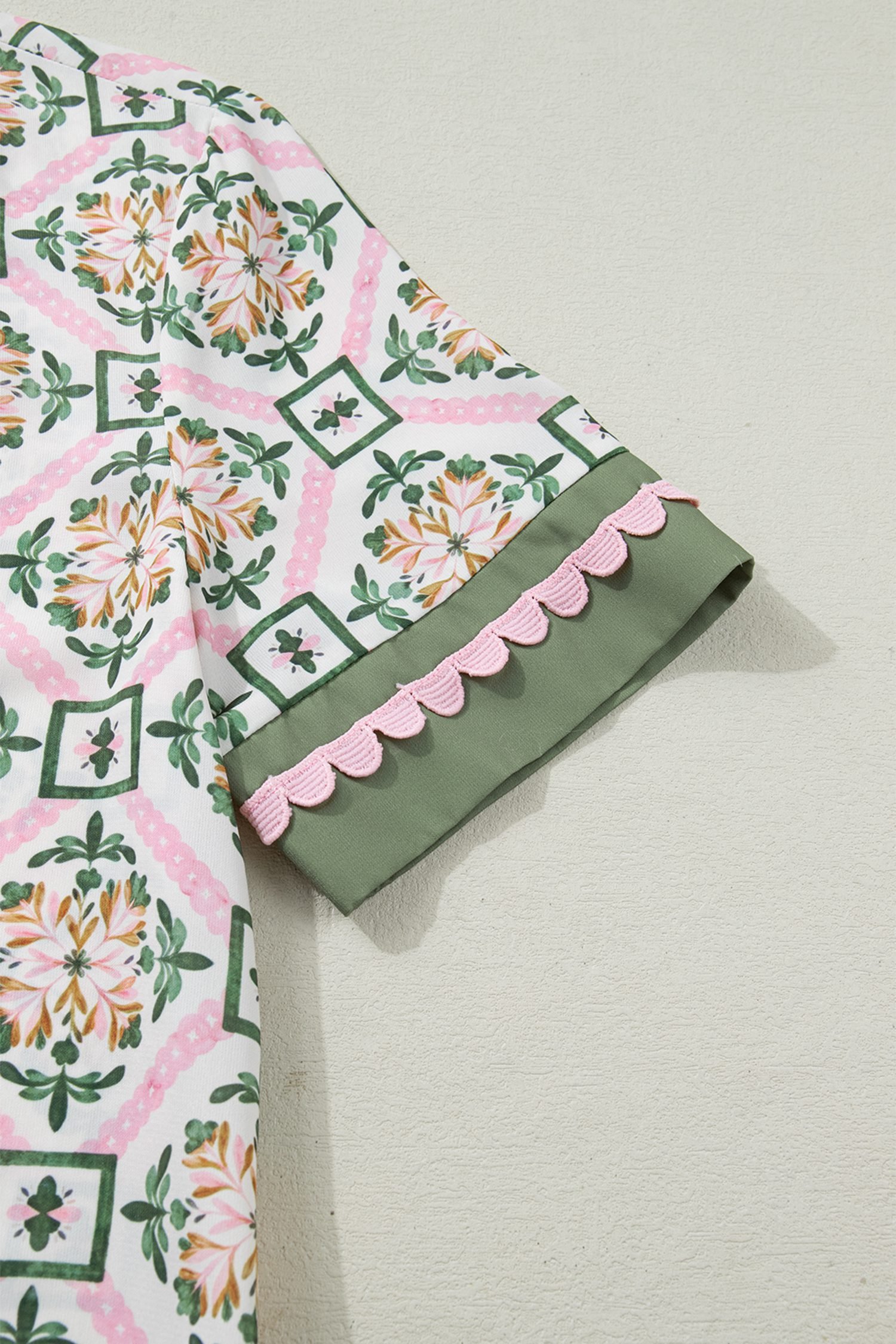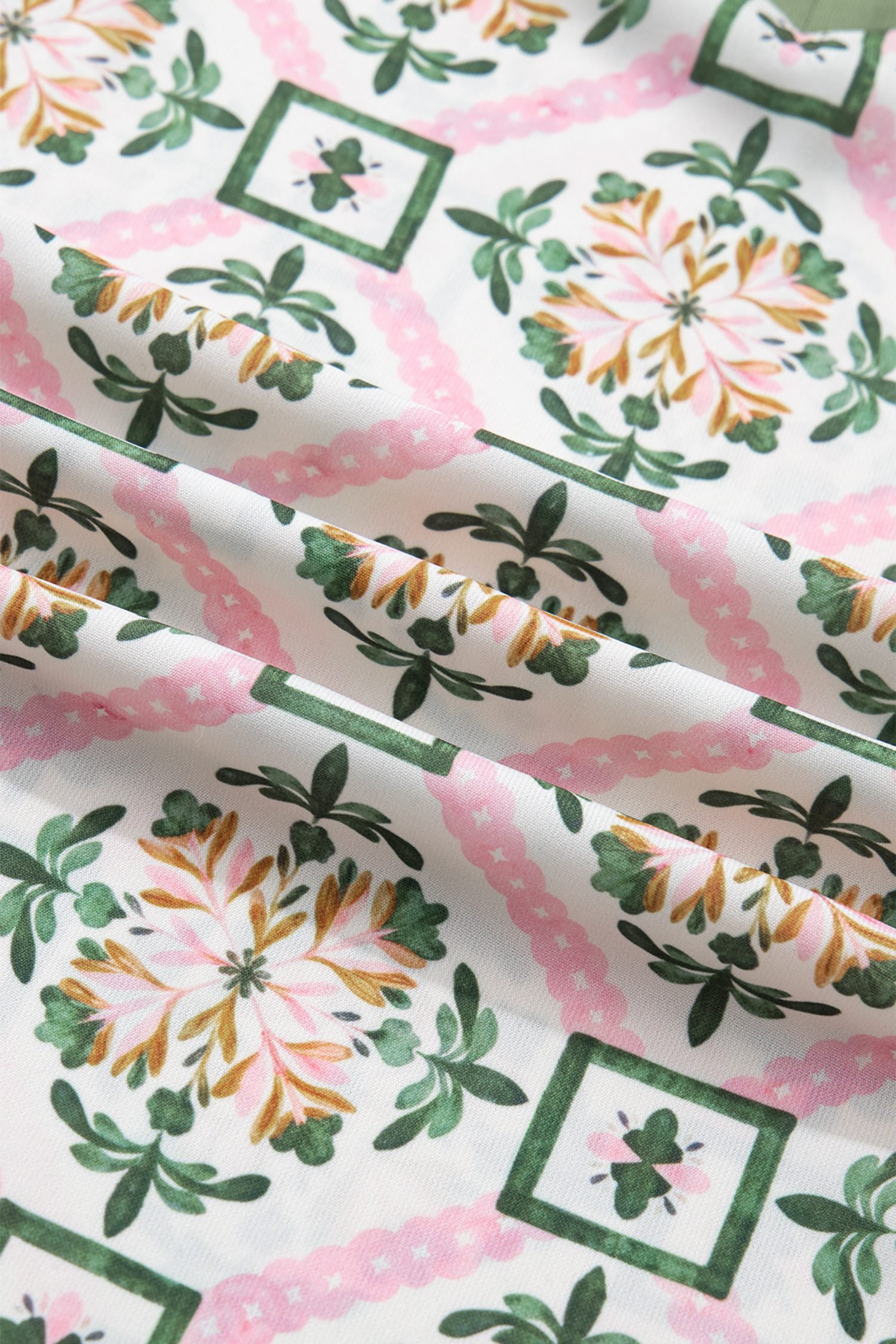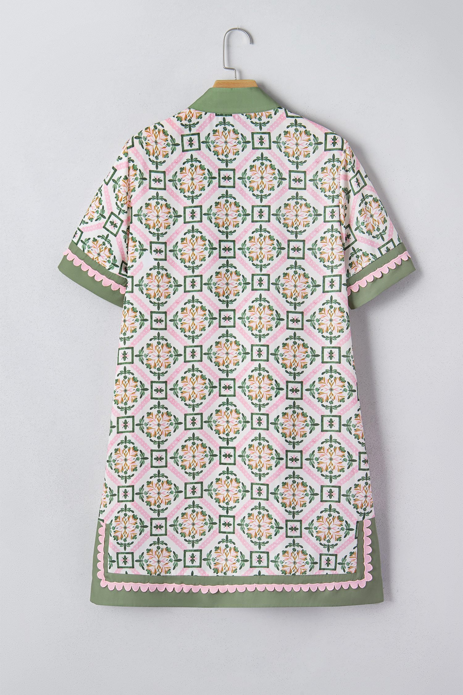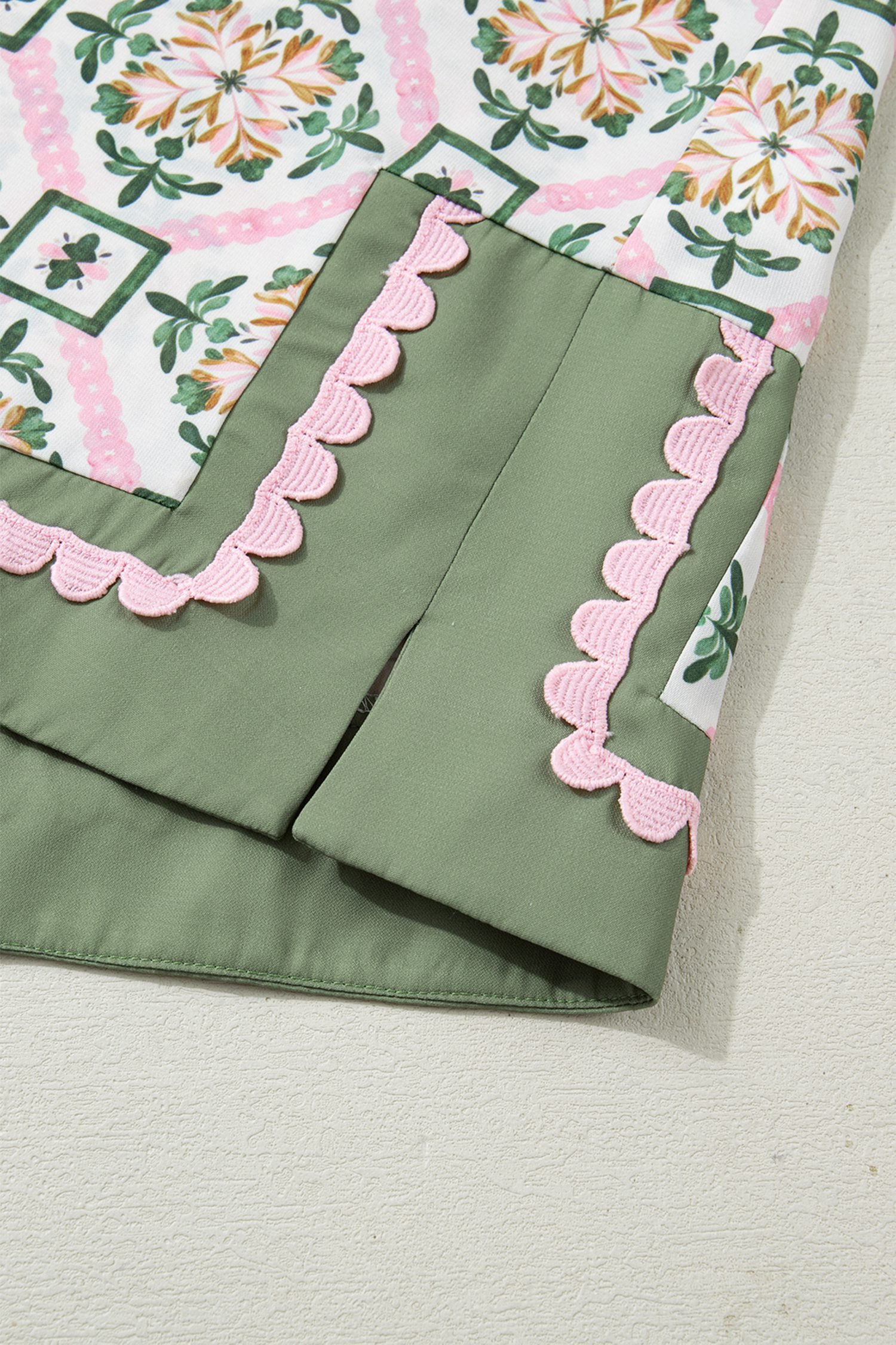Featuring a geometry-inspired floral print, scallop, and color block details.