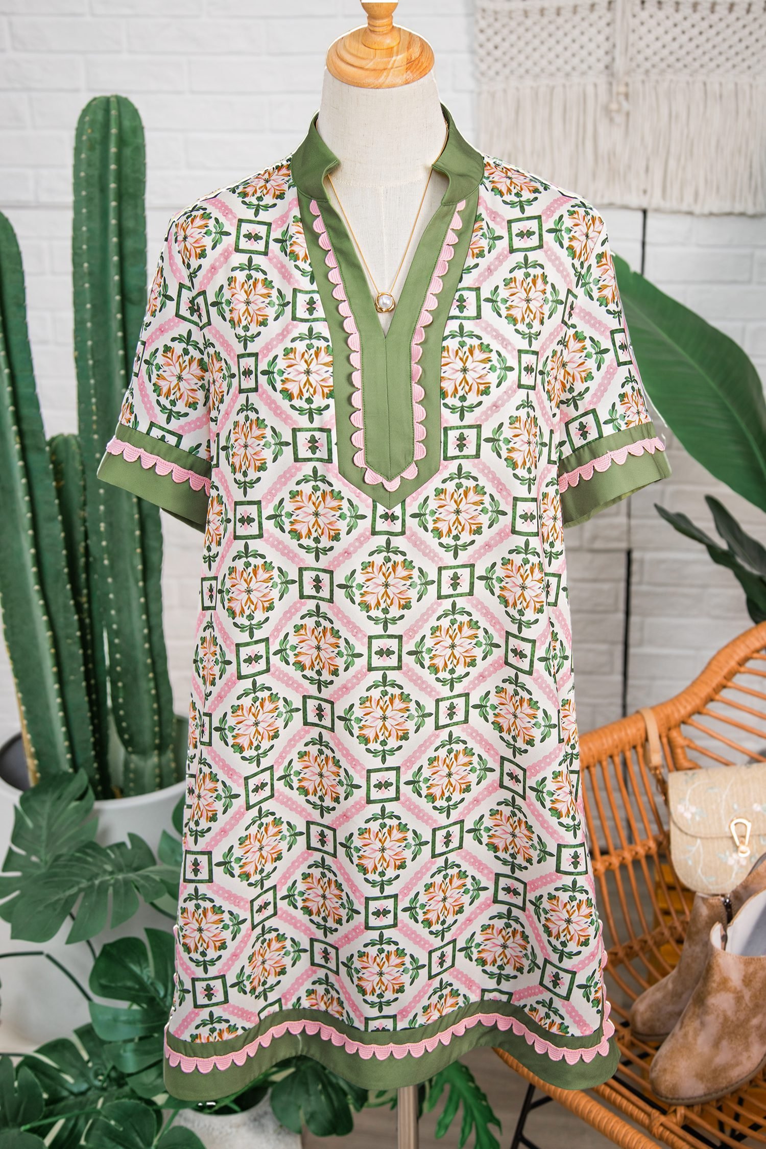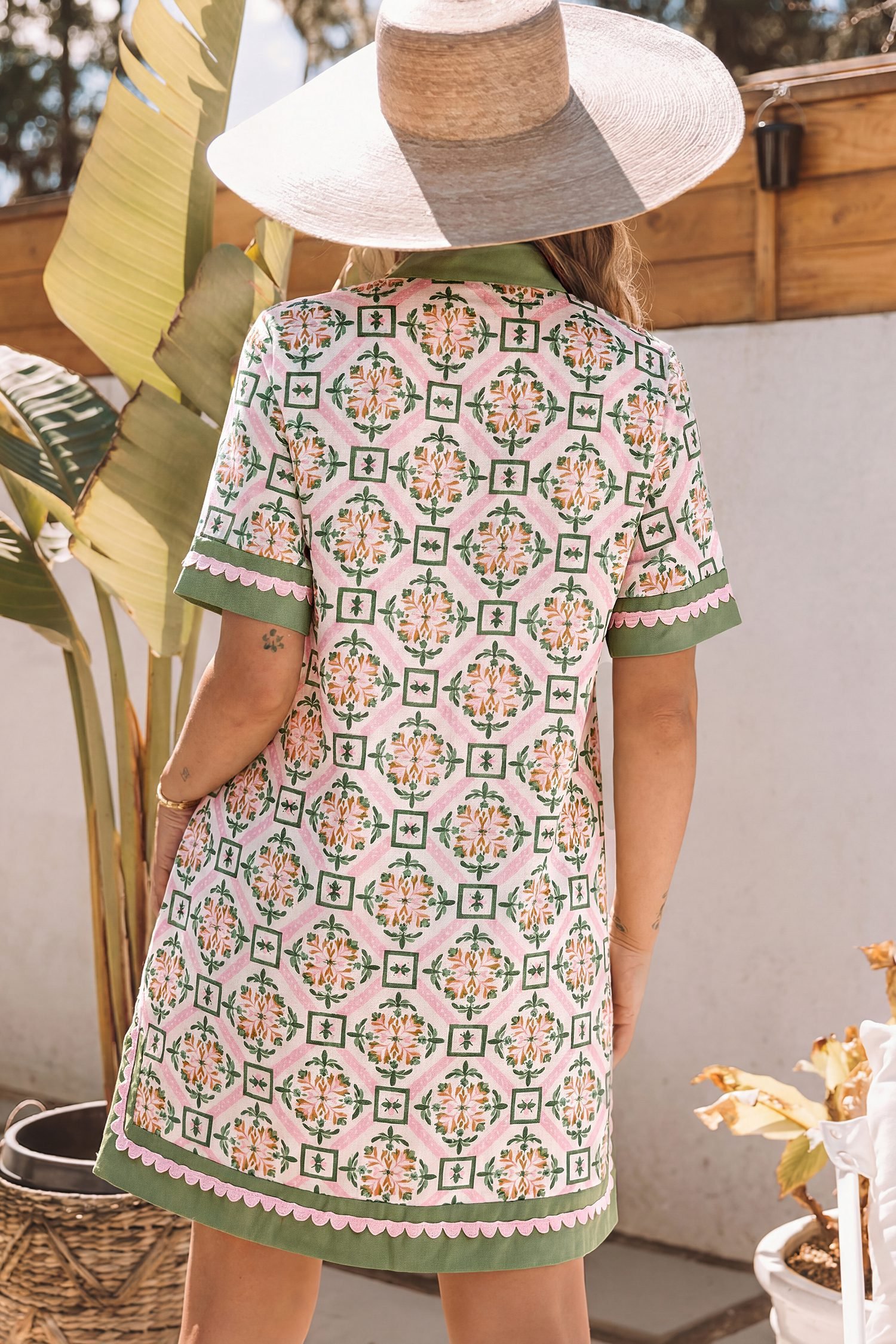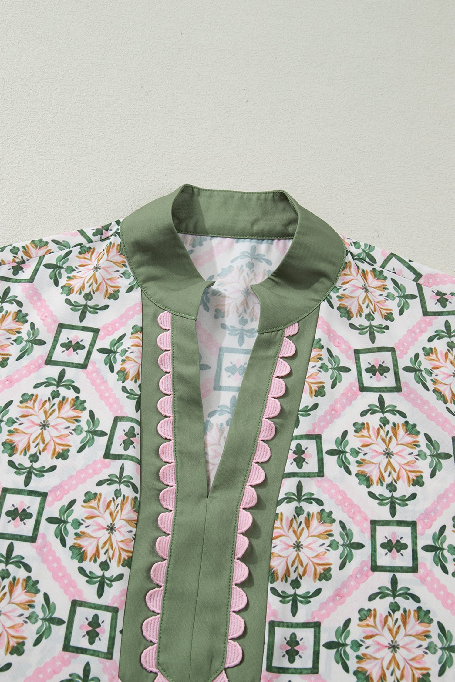 Featuring a geometry-inspired floral print, scallop, and color block details.