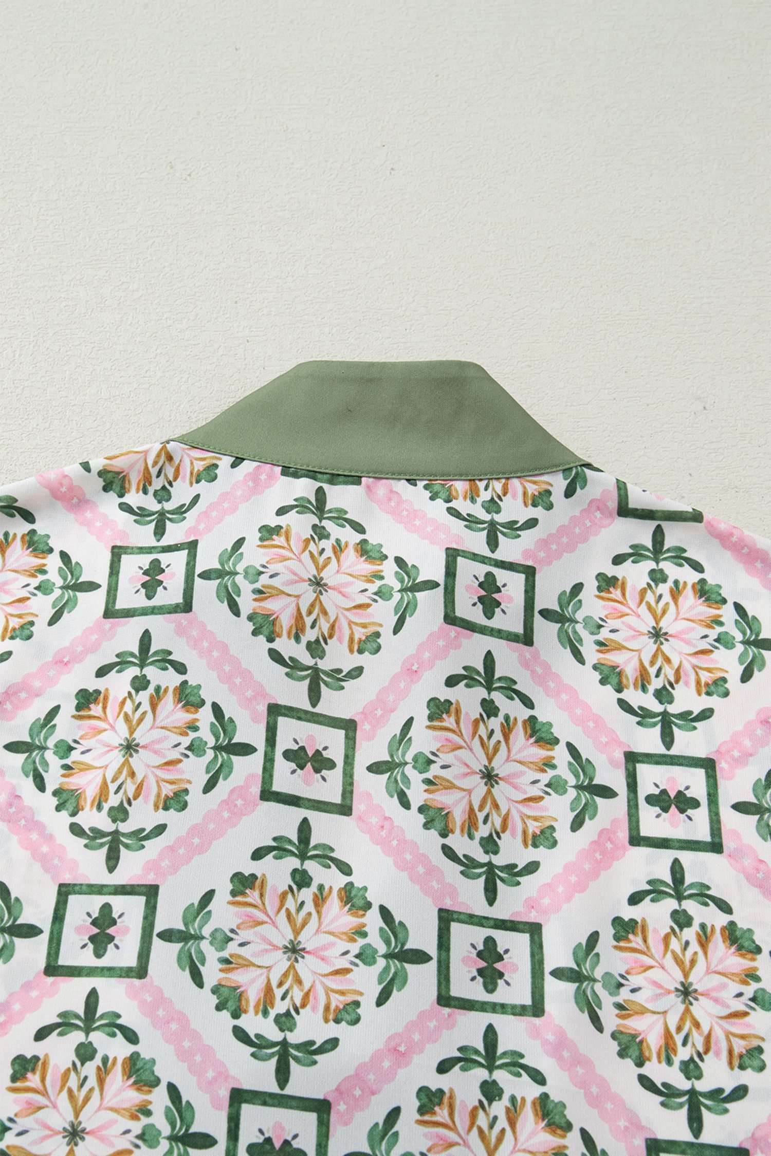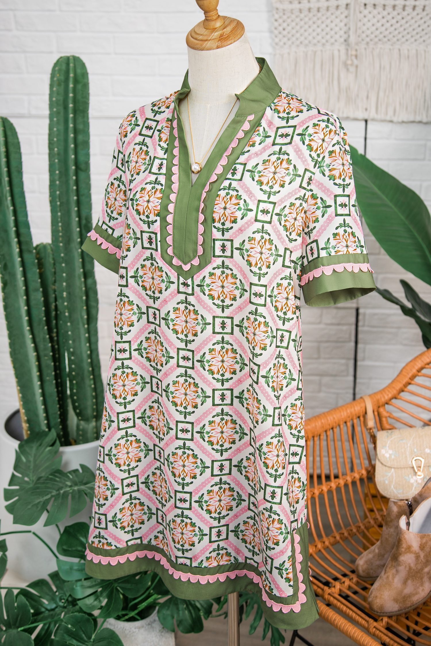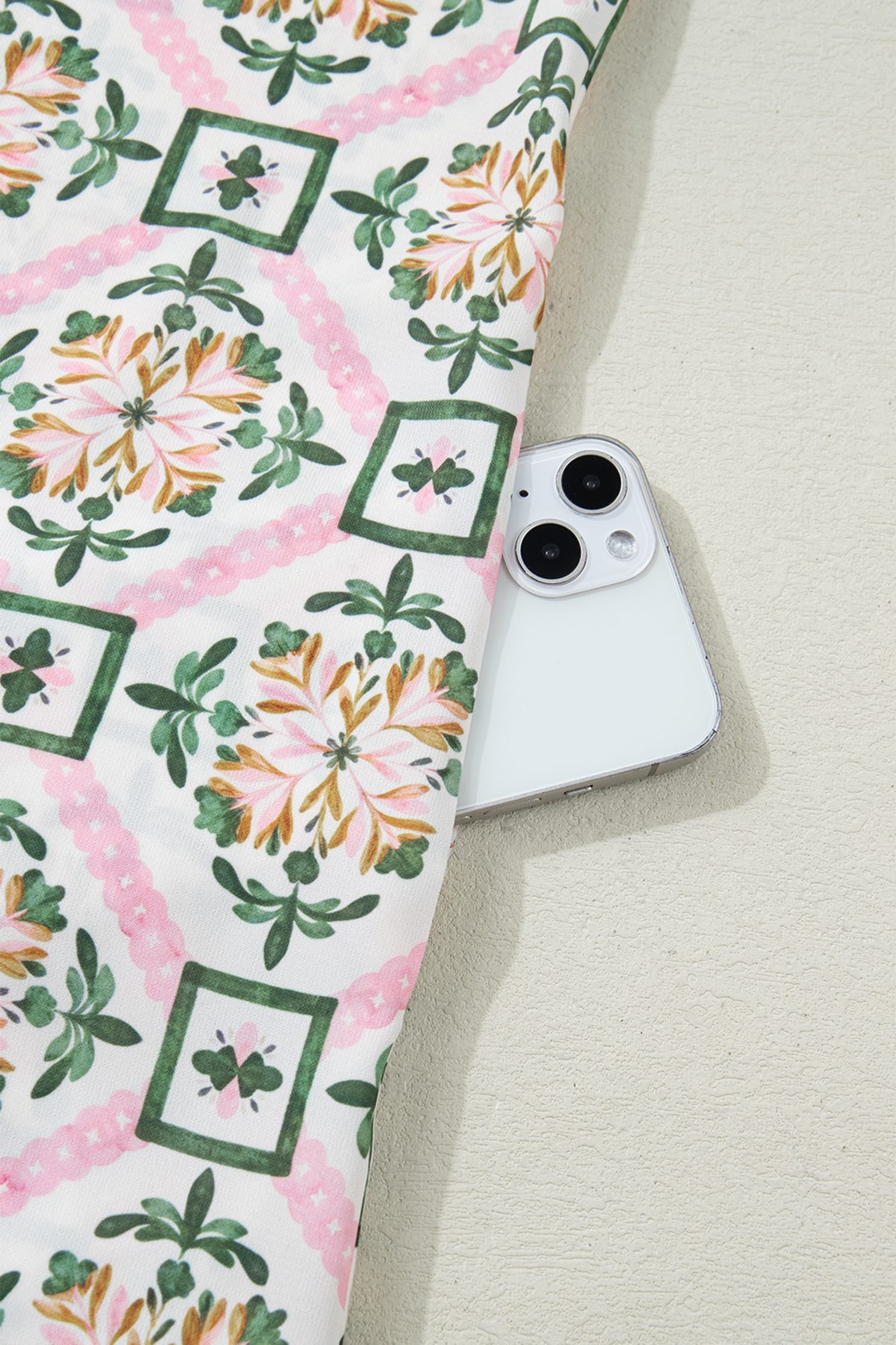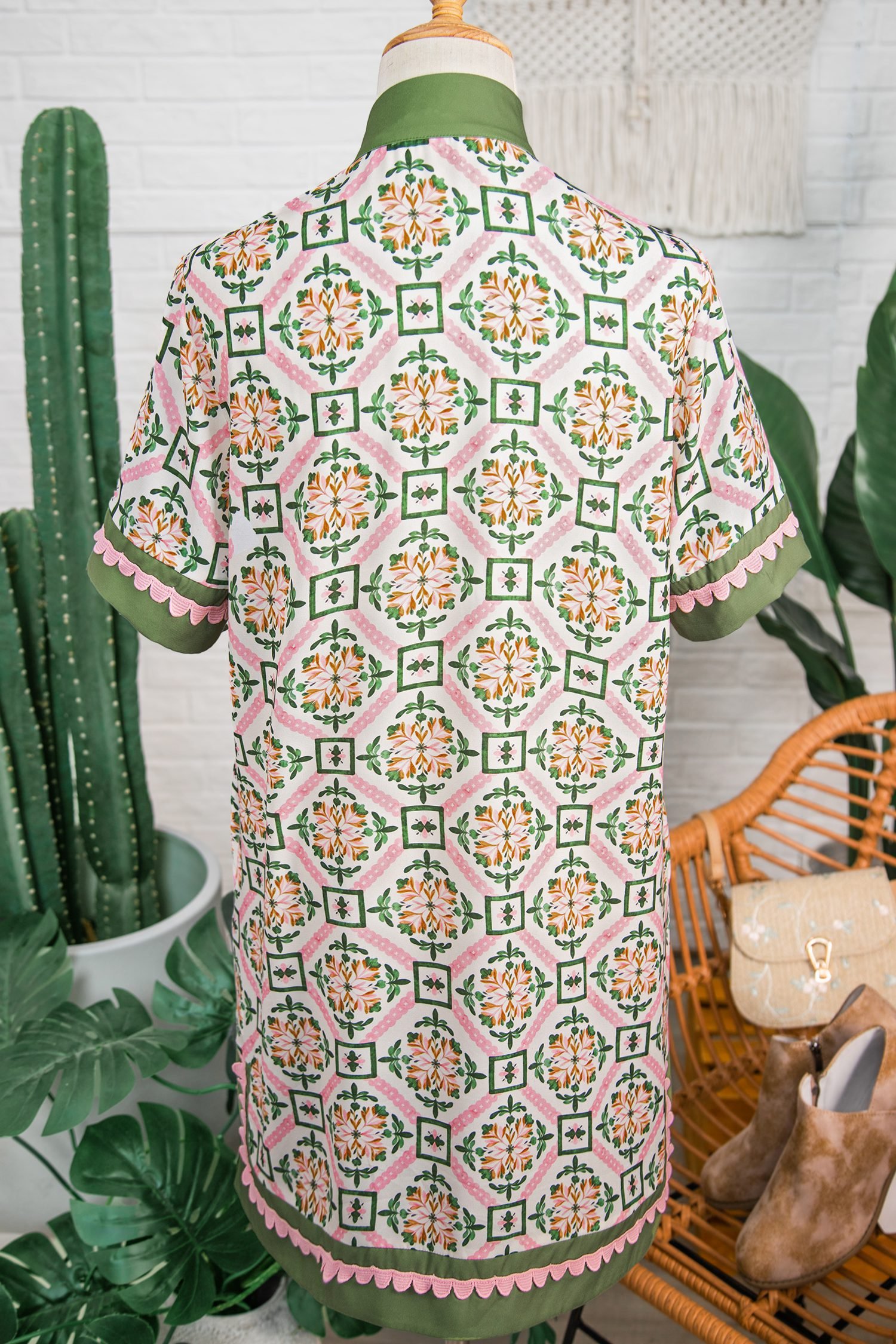 Featuring a geometry-inspired floral print, scallop, and color block details.
