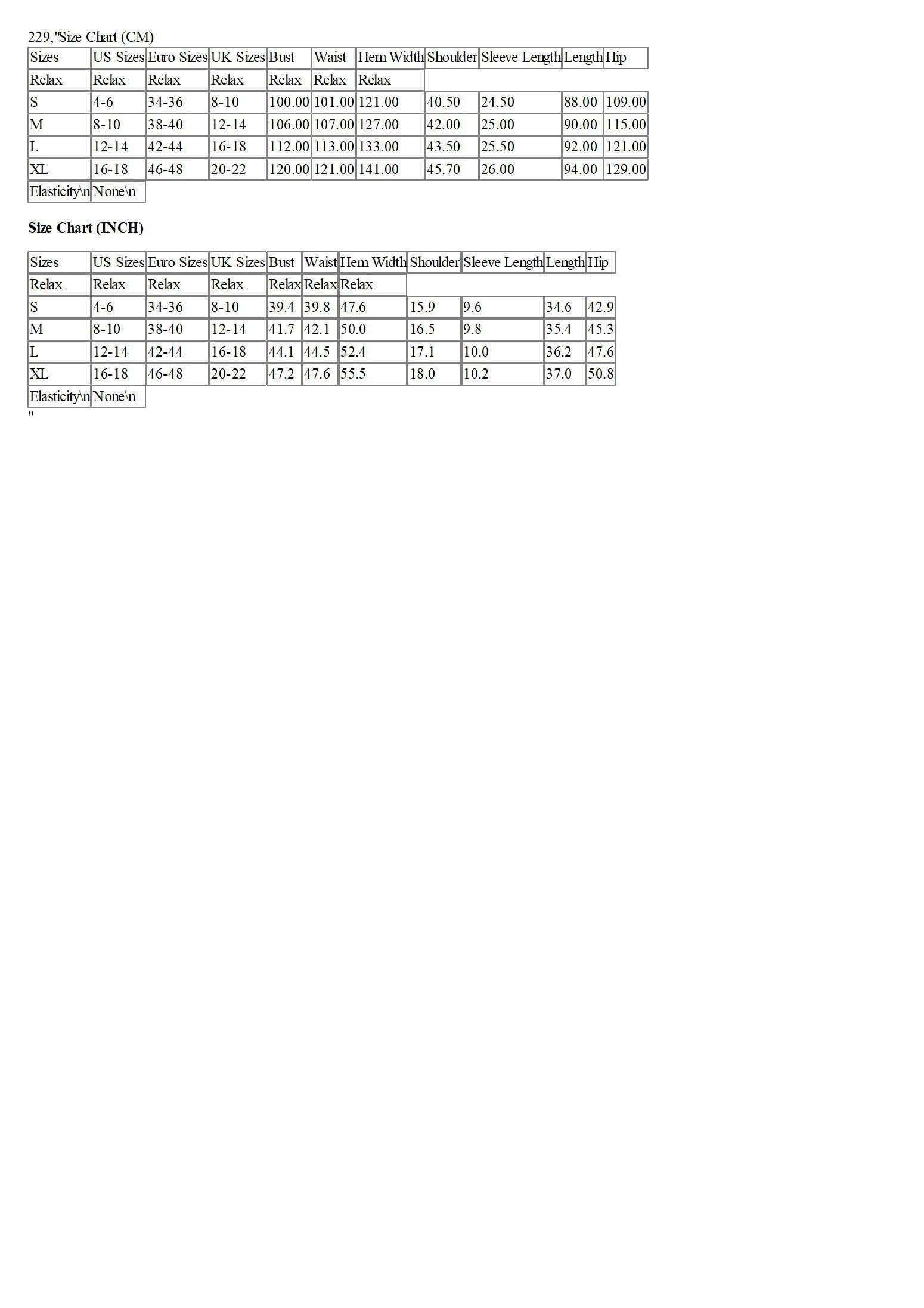 Sizes | US Sizes | Euro Sizes | UK Sizes | Bust | Waist | Hem Width | Shoulder | Sleeve Length | Length | Hip |