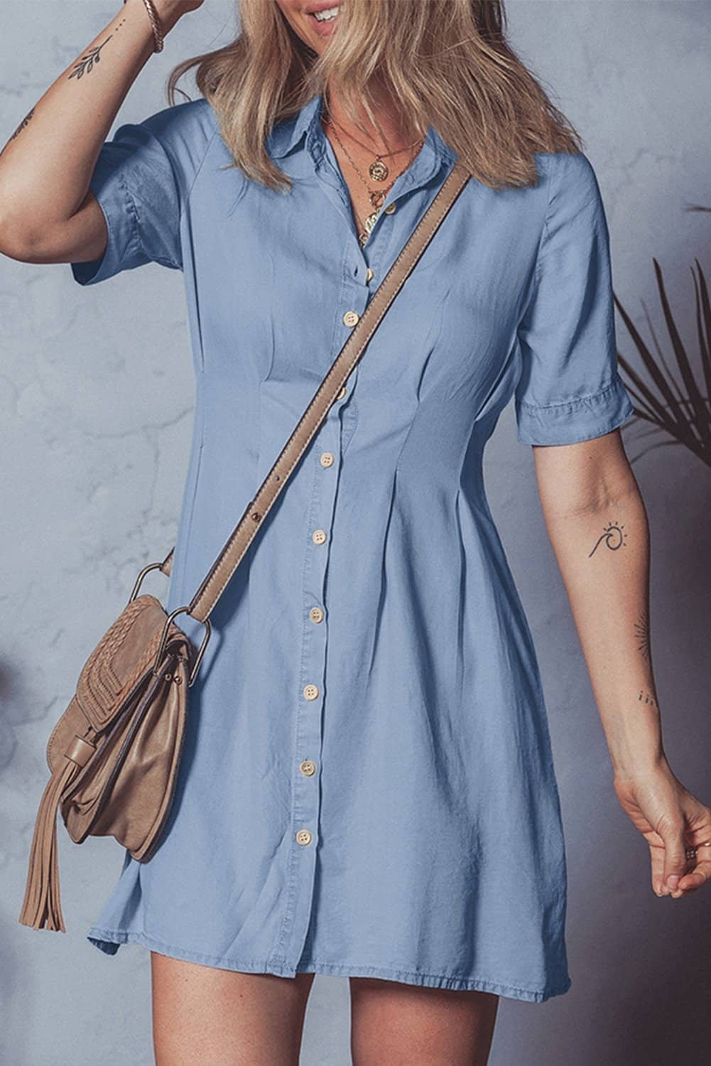 Pleated details add a chic detail to the chambray dress.