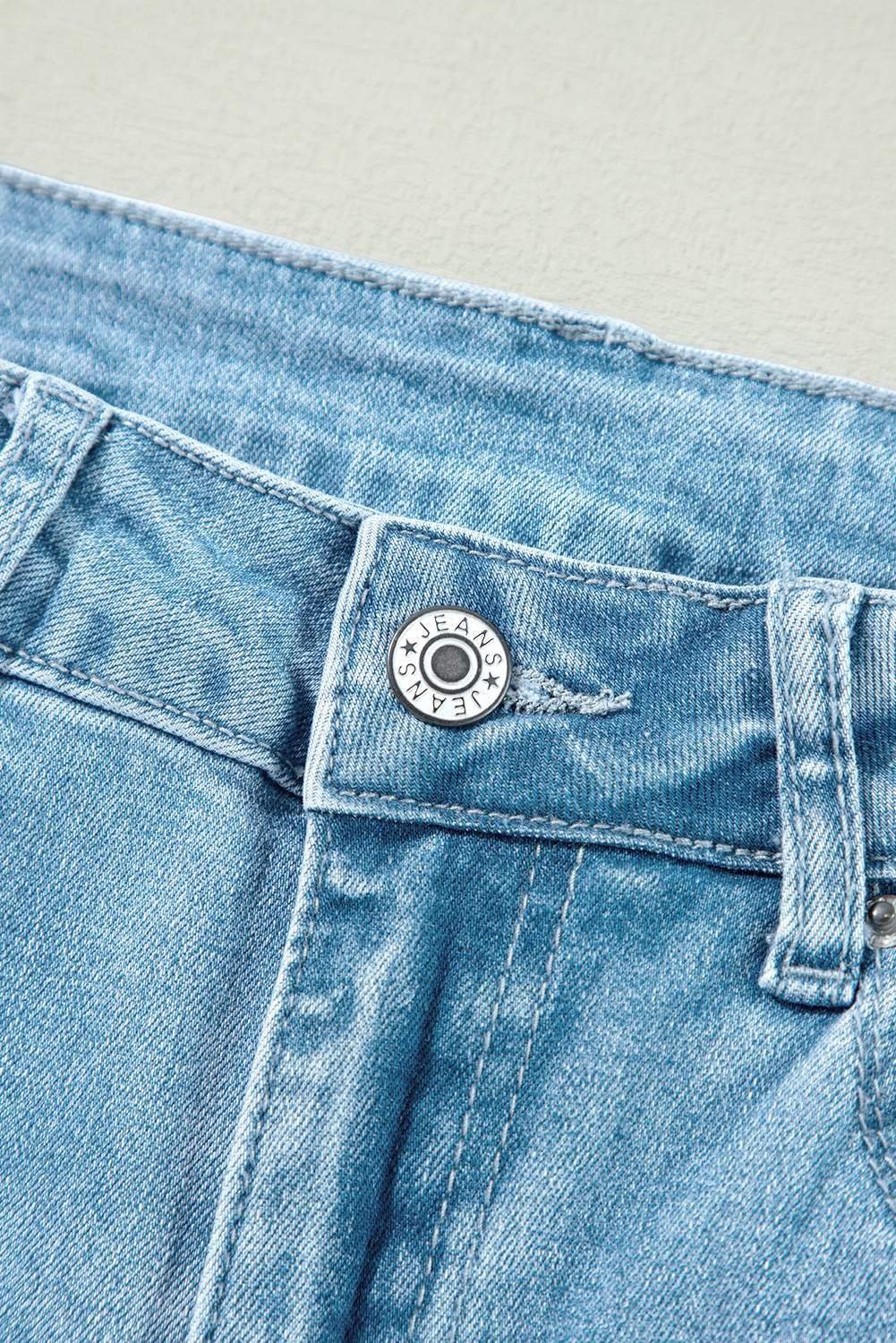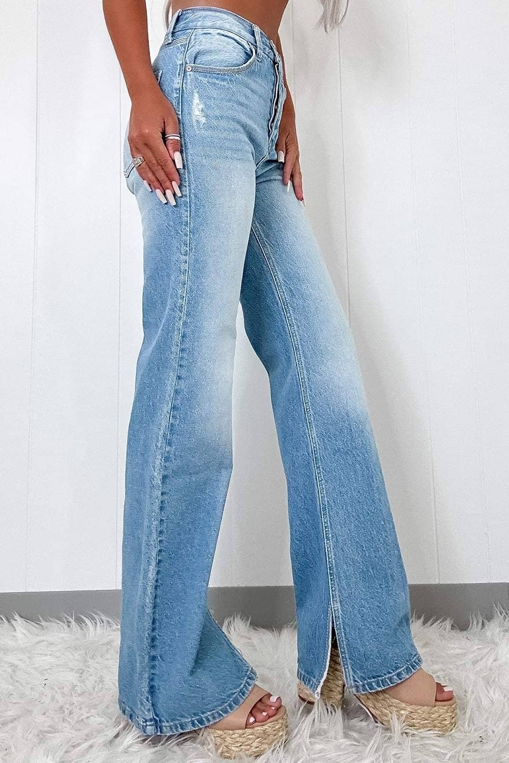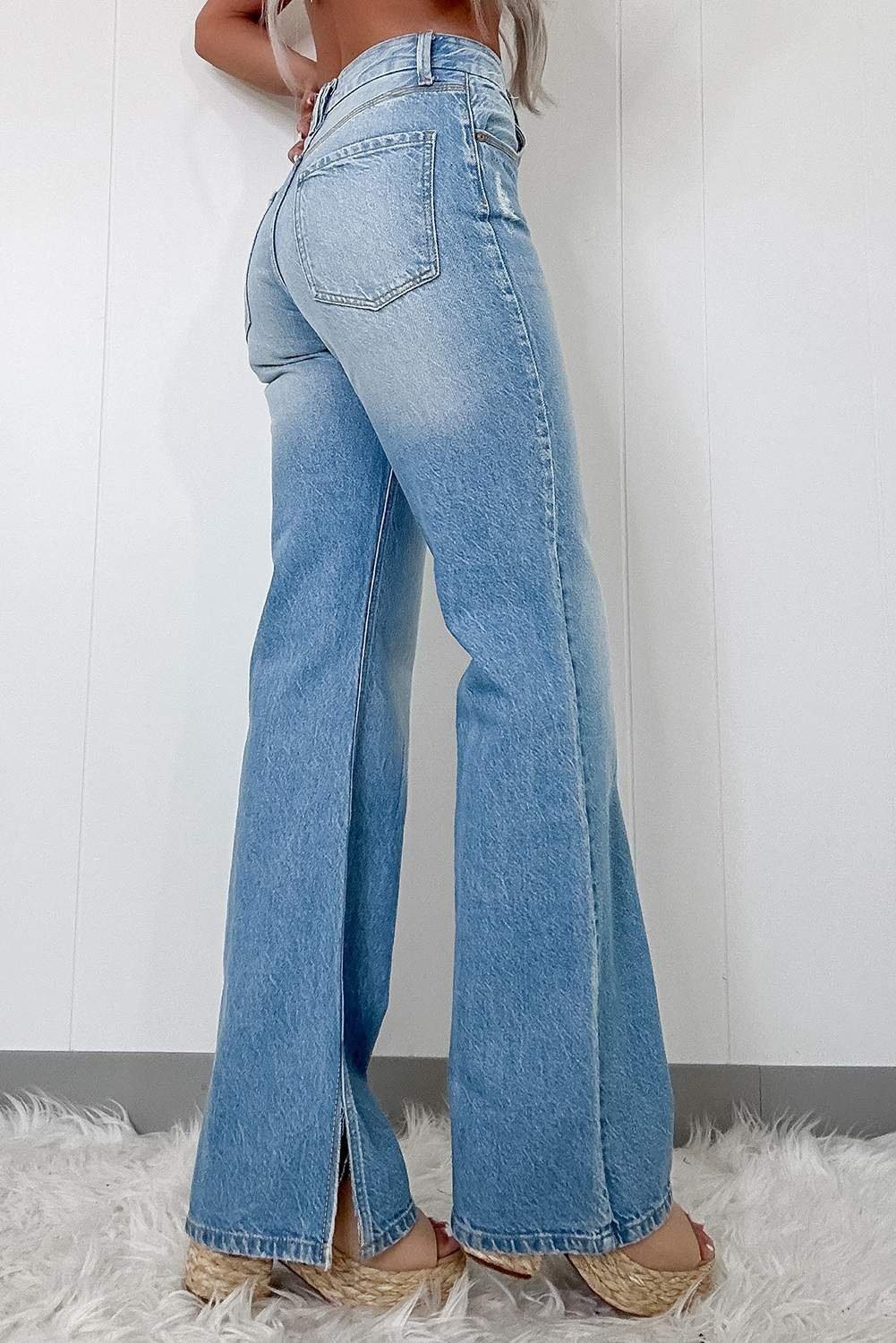 • Transform your look with our High Rise Shift Slit Leg Straight Jeans in a light wash.