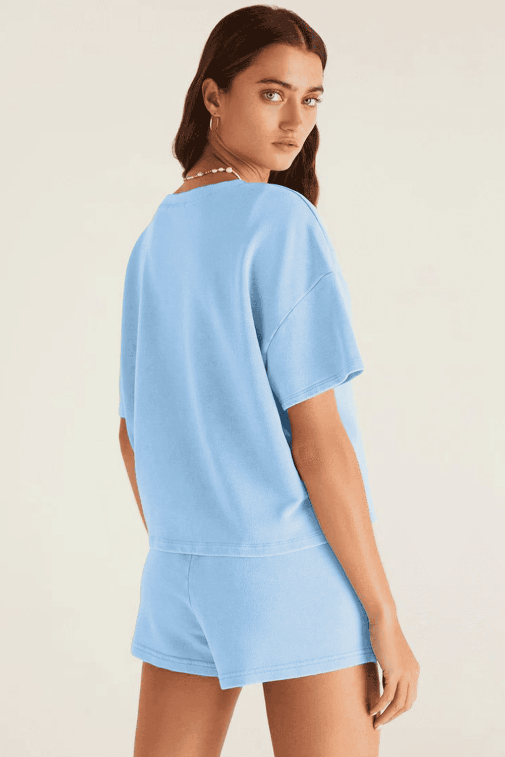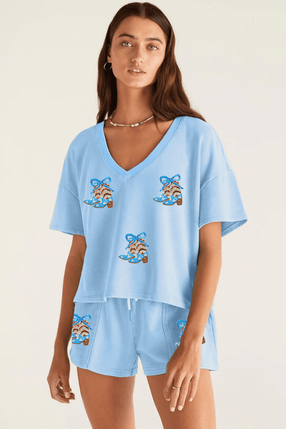 Myosotis Patriotic Sequin Boots Patched V Neck Tee Loose 2Pcs Short Set