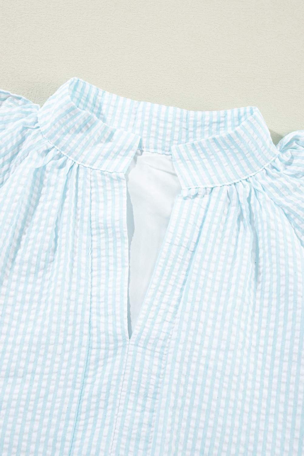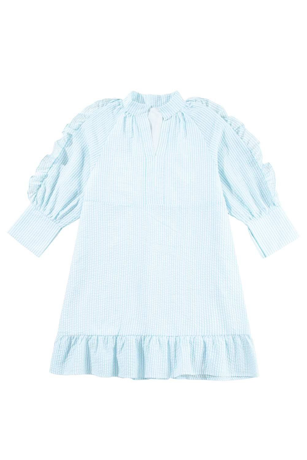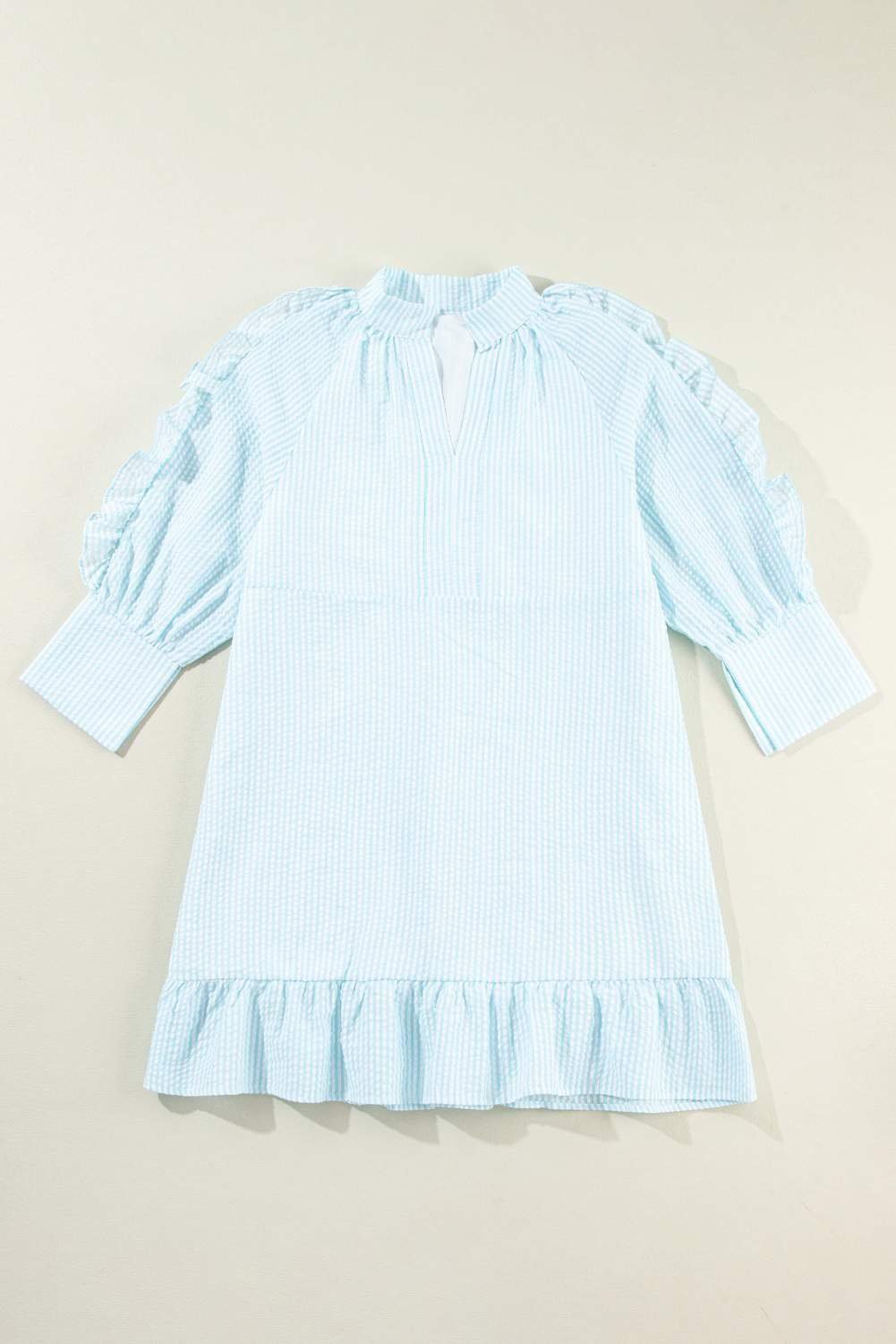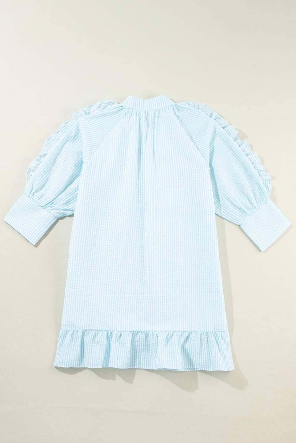Myosotis Seersucker Ruffled Puff Sleeve Stand Neck Mini Dress