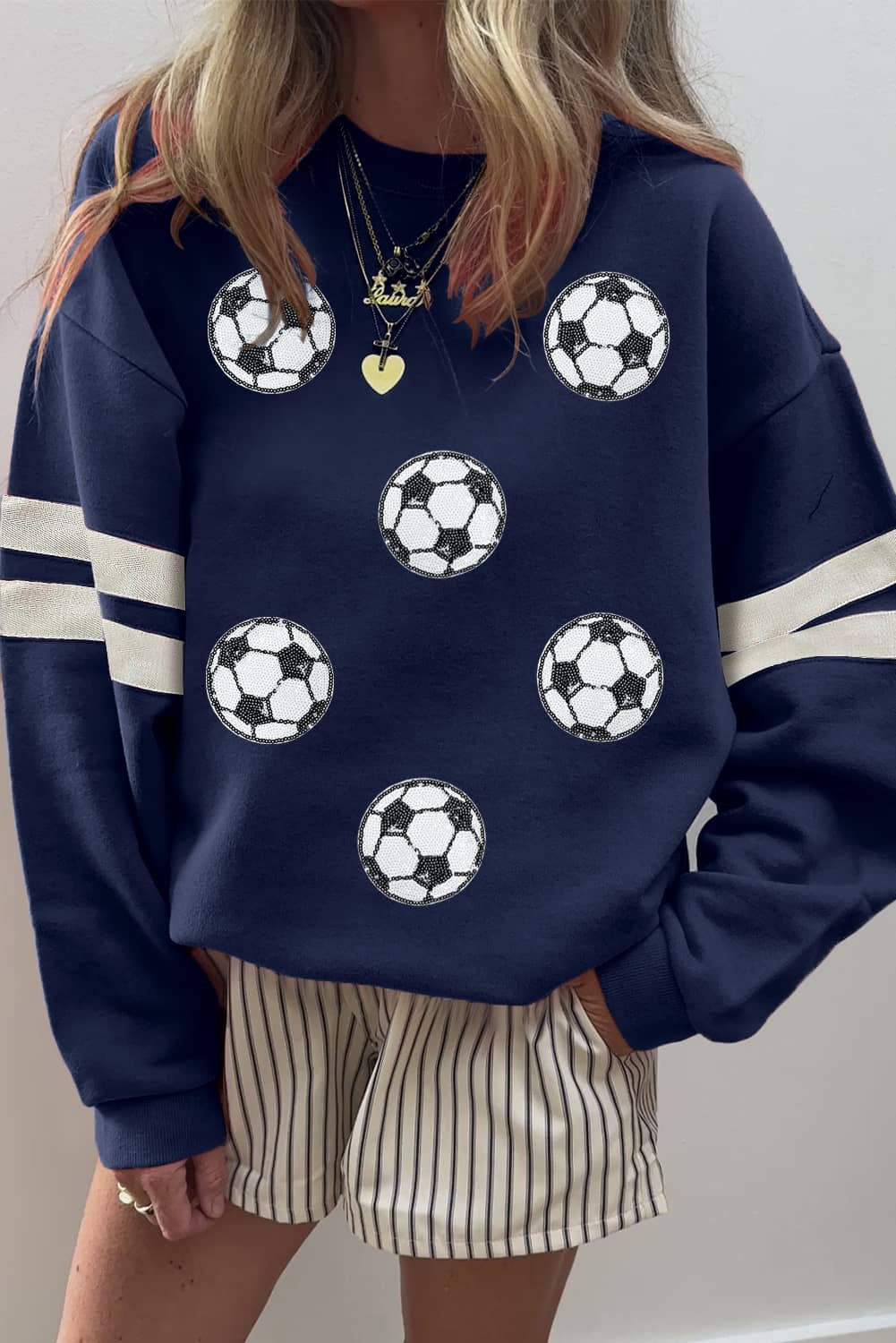 Navy Blue Soccer Football Sequin Patched Graphic Oversized Varsity Sweatshirt