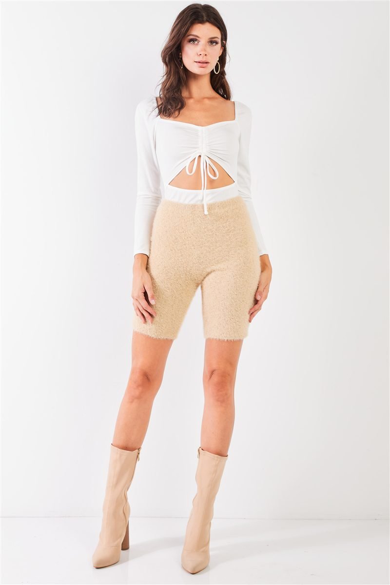 Oatmeal Beige Knit High Waist Stretchy Warm Fuzzy Biker Shorts