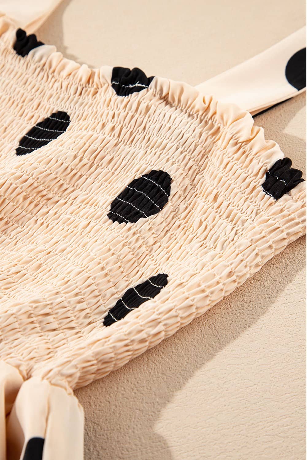 It features a flattering silhouette, smocked bodice, high waist and flowy skirt.