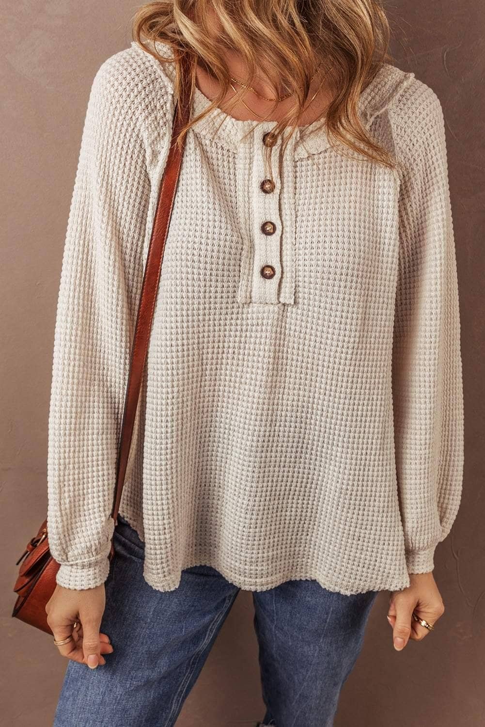 - This waffle knit blouse is cozy and textured.