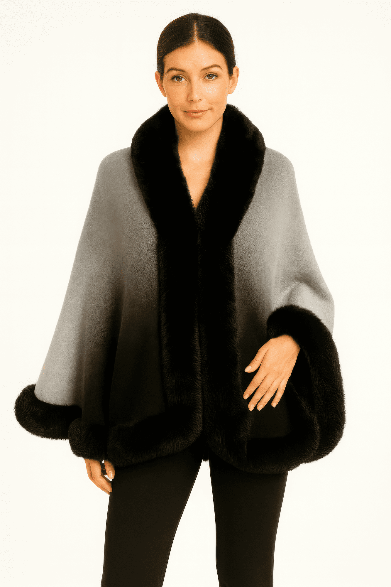 Soft ombré grey cape with plush faux fur trim