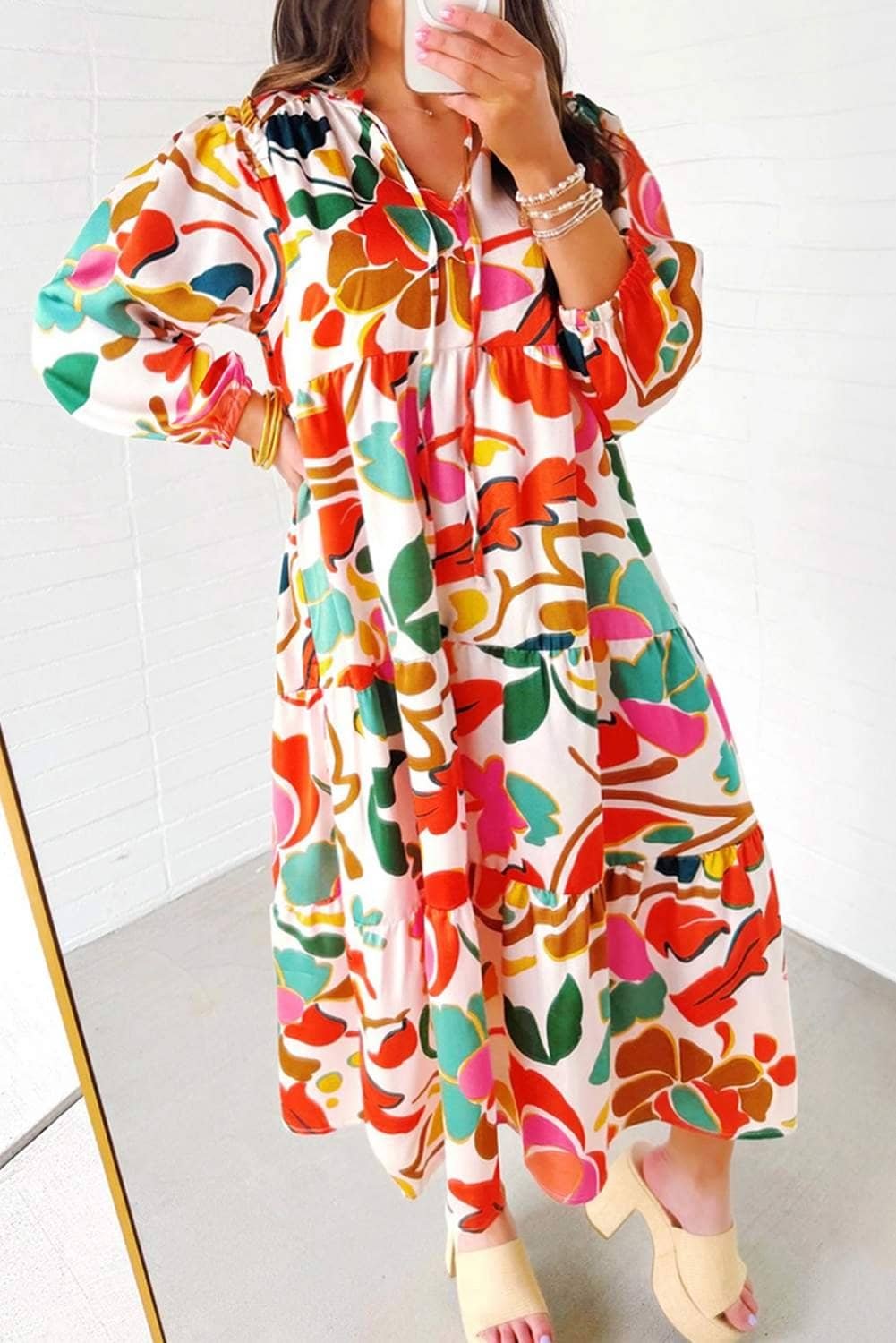 - The dress is adorned with a beautiful floral print that brings a touch of nature elegance.