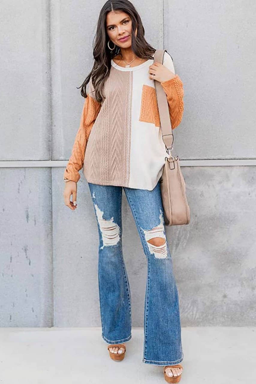 Be the first to review “Orange Long Sleeve Colorblock Chest Pocket Textured Knit Top”