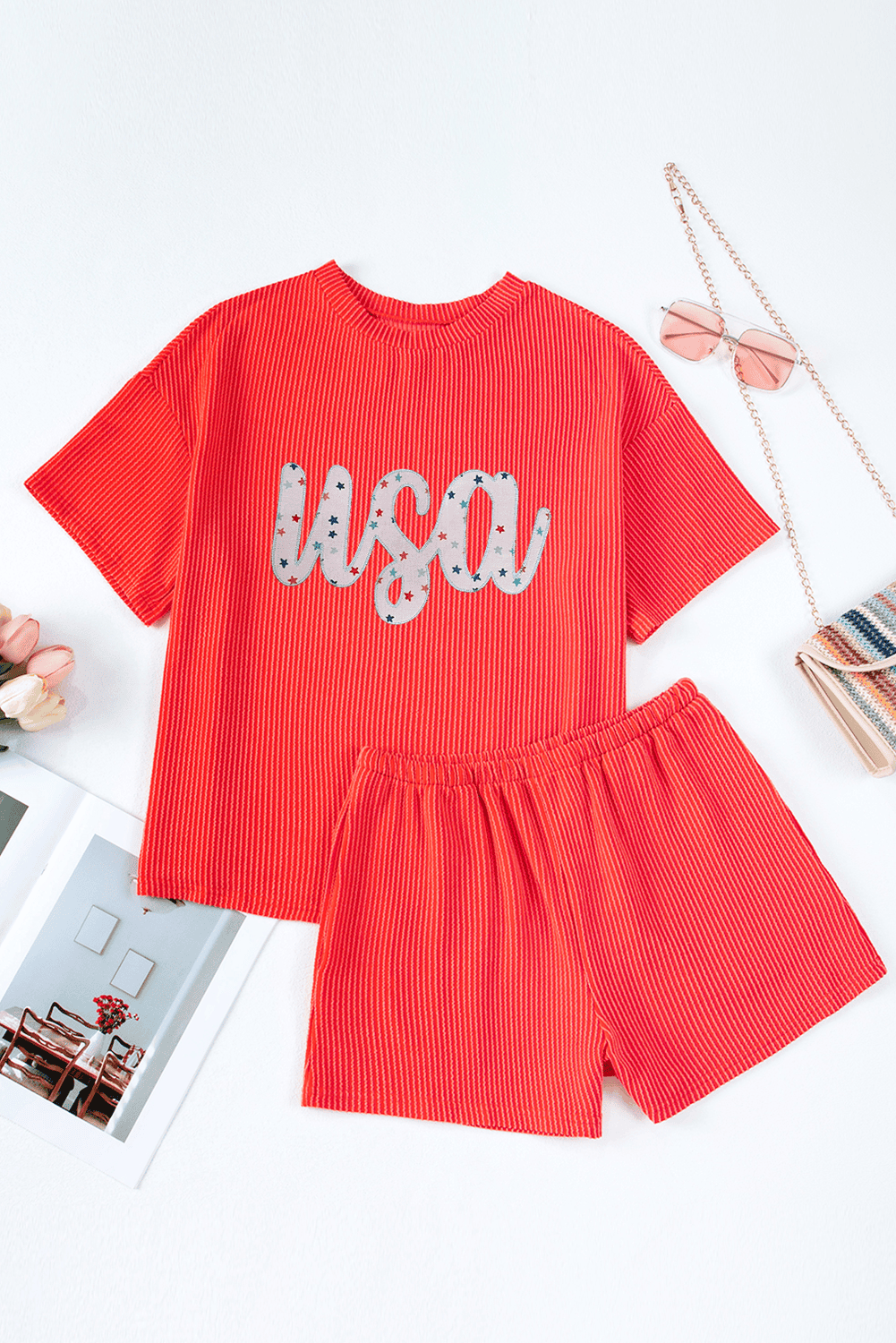 - Patriotic two-piece set featuring star print and “USA” embroidery, perfect for festive occasions.