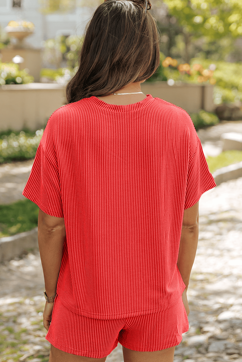 Classic short sleeves and matching shorts offer a cohesive, stylish look for warm weather.