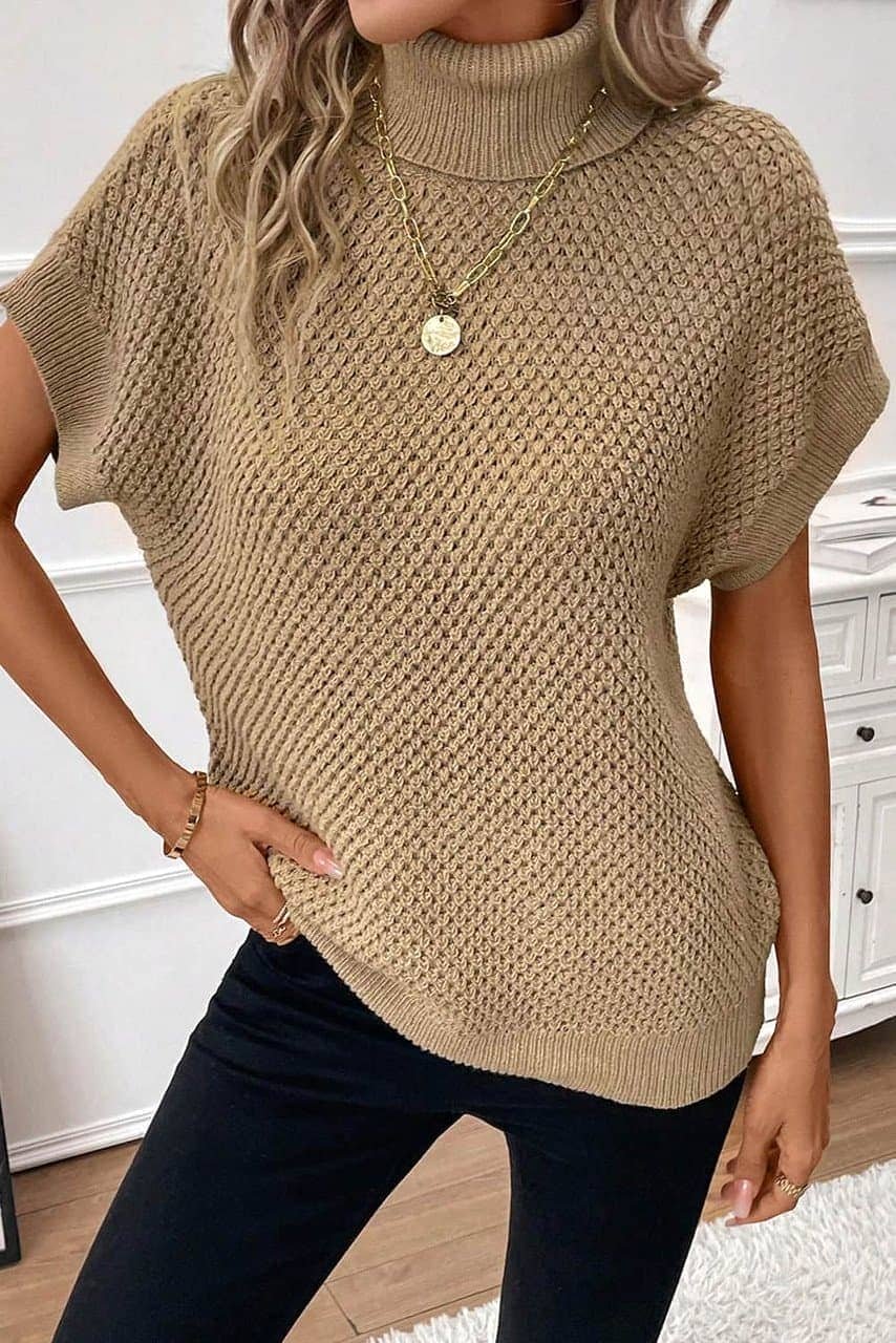 - It features an elegant turtleneck, short sleeve and relaxed fit