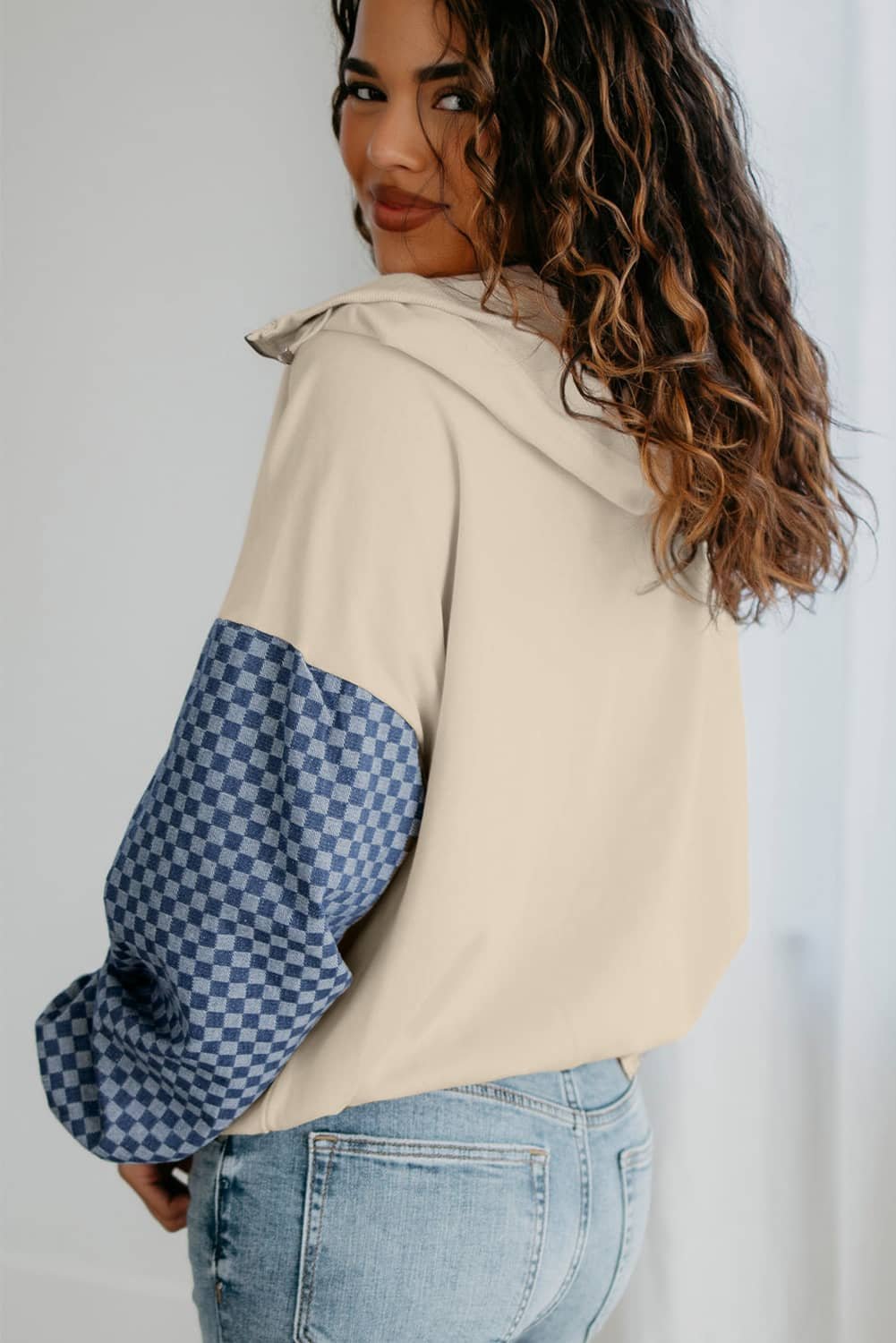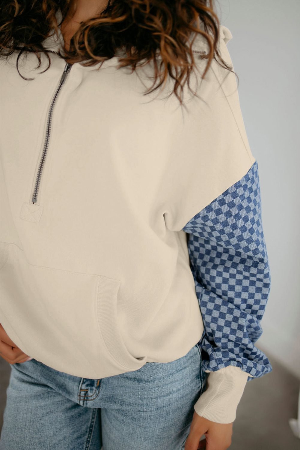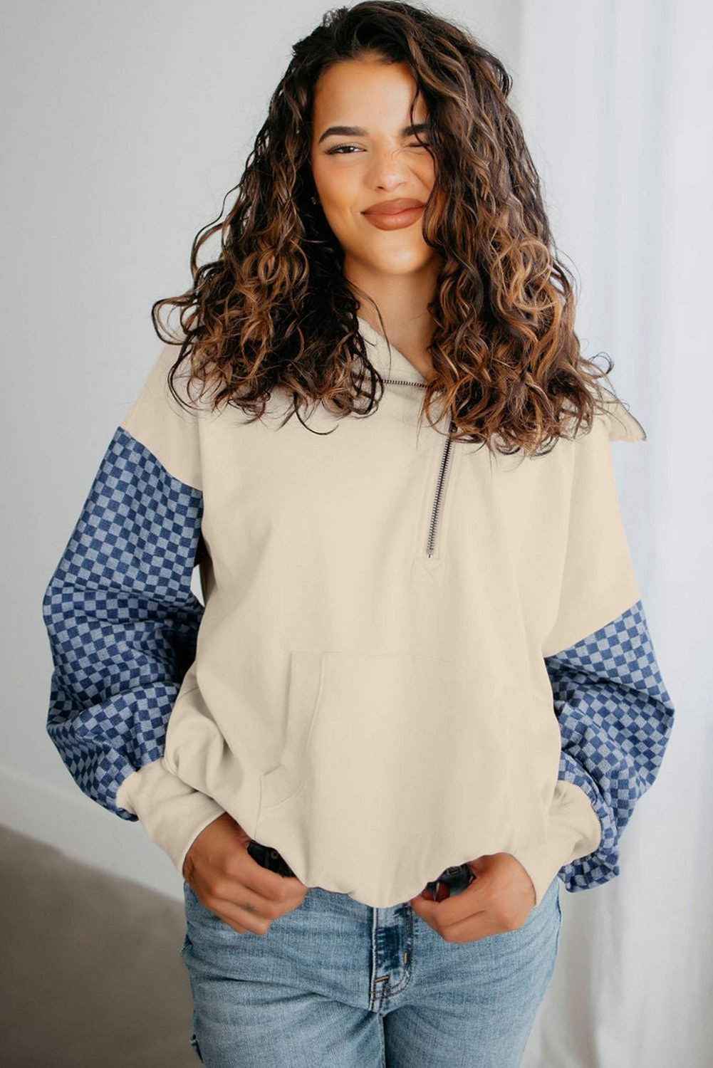 Parchment Checkered Patchwork Kangaroo Pocket Half Zipper Hoodie