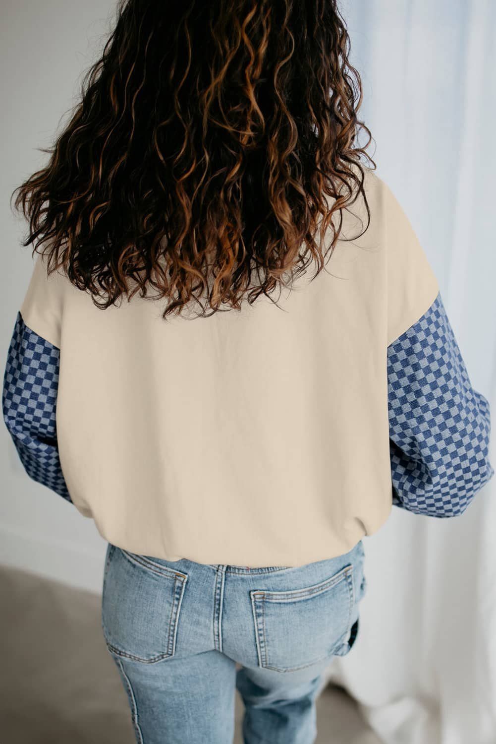 Be the first to review “Parchment Checkered Patchwork Kangaroo Pocket Half Zipper Hoodie”